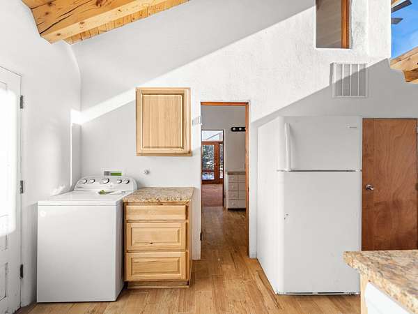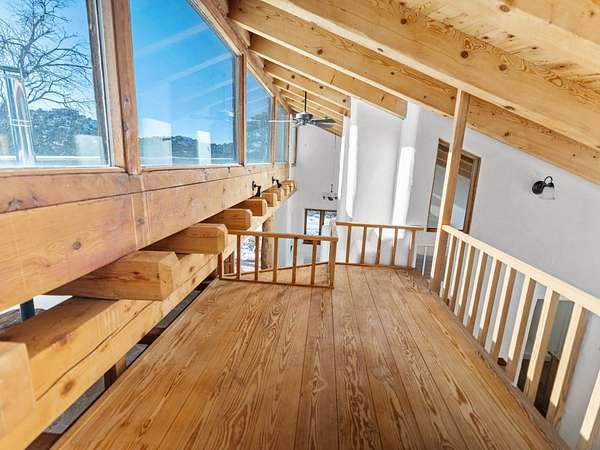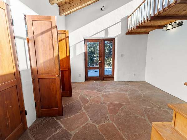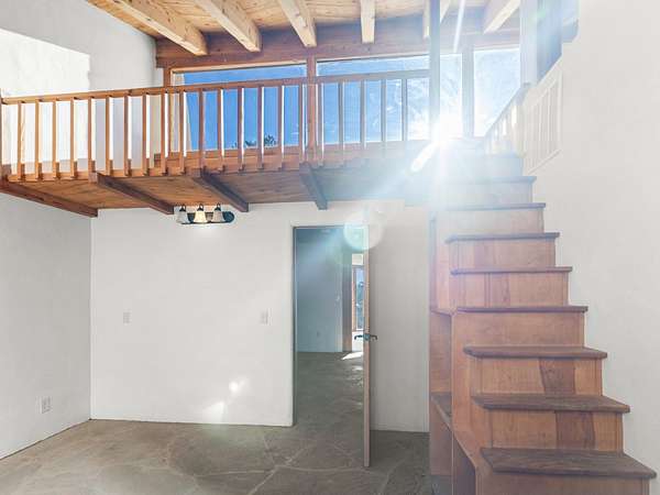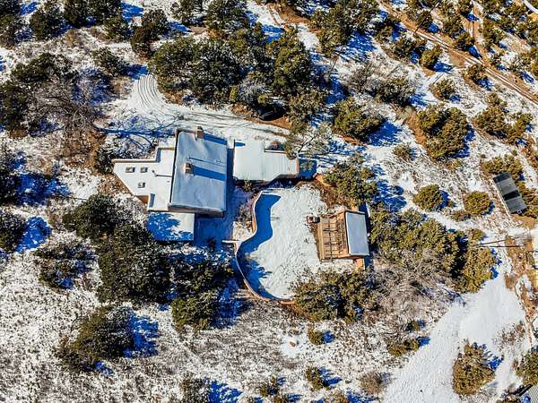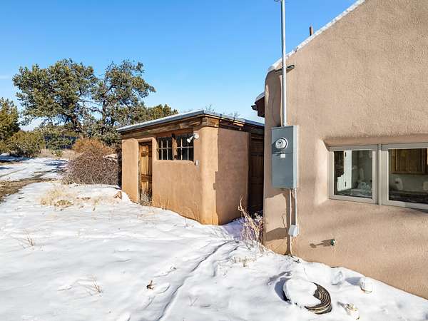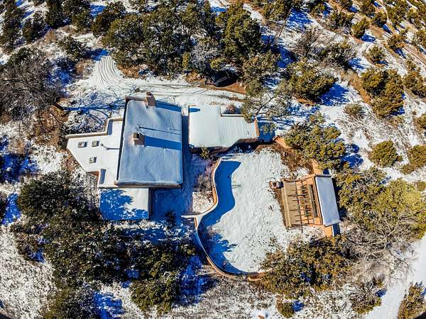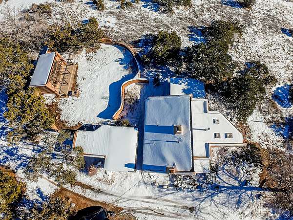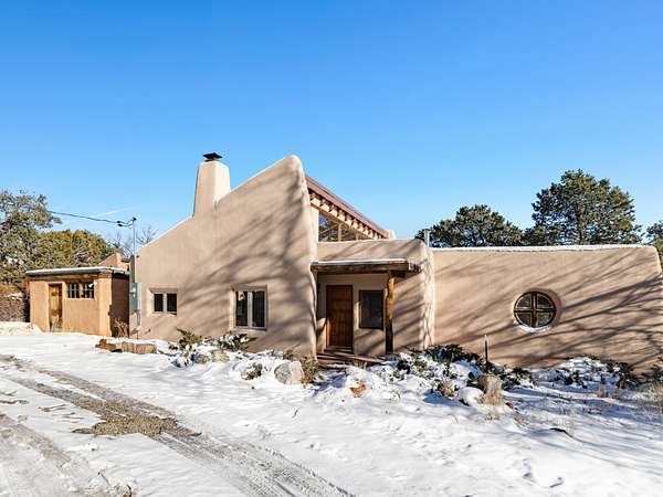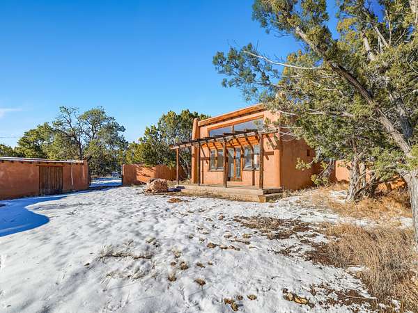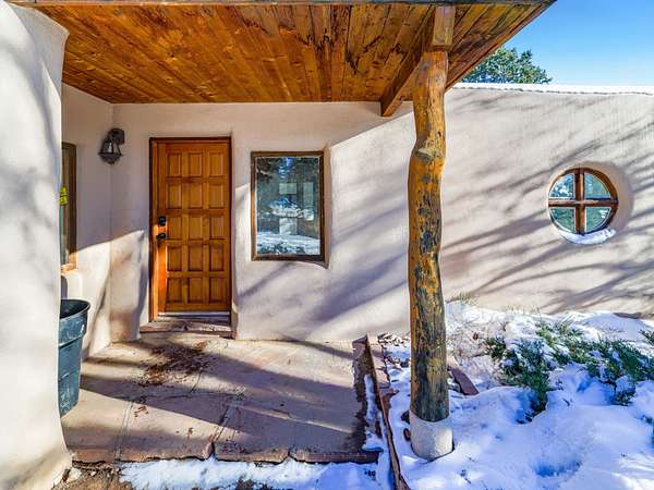 Nestled on 5 quiet, wooded acres, this 1523 sq. ft. passive solar home is bathed in natural light. A circular driveway makes coming and going a breeze. Inside you will find plenty of character, from the high clerestory windows to the rustic flagstone floors. Cozy up on chilly nights by the fireplace or the wood stove and read a book in the sun room in the afternoons. Primary bedroom features a loft, perfect for storage while a flexible den or hobby room could easily serve as a bedroom with addition of a closet. Creatives and artists will love the 240 sq. ft. separate studio and workshop area, both surrounded by a beautiful adobe wall.