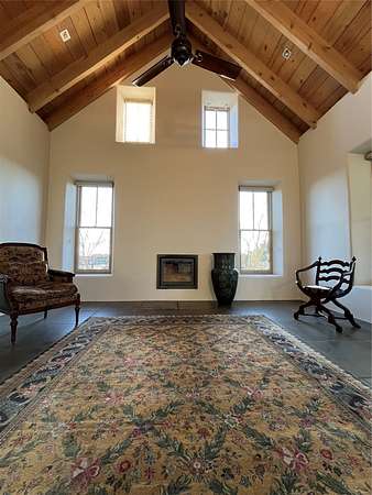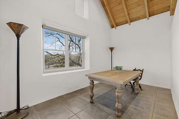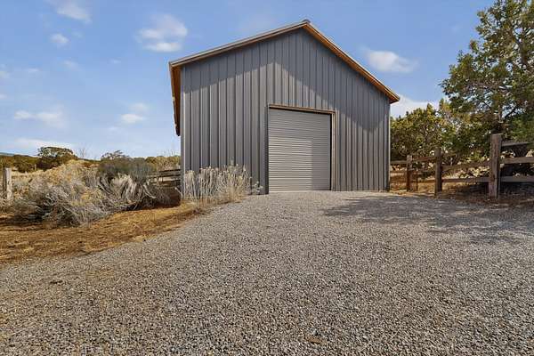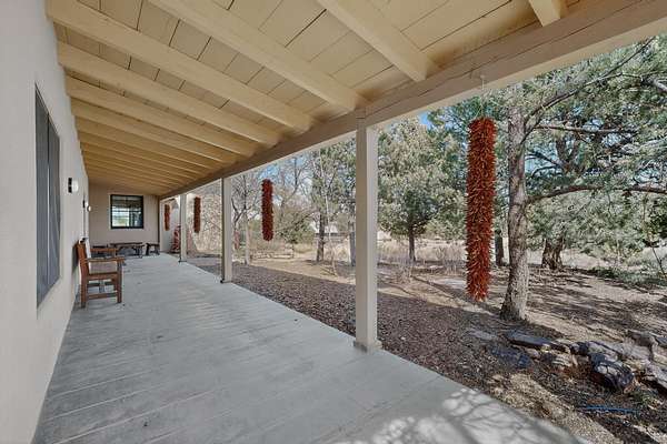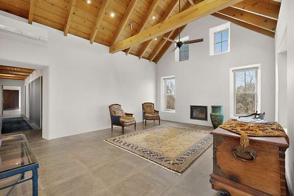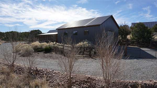Private country retreat, easy drive to town, a find. This Northern New Mexico sweetheart house on exquisite land has mountain views, a well-kept open barn and corrals and pens. No horses? Park your RV securely in the spacious newly sided barn with heavy-duty remote-operated metal doors or set it up for wonderfully lit workshop space. Got dogs? Lots of room to run in several fenced areas. Love to hike? Great adjacent trails - including the Rail Trail and Arroyo Hondo Open Space trails, no driving necessary. Dining out? Nearby options and just a 15-minute hop to all downtown Santa Fe offers. Love the cathedral ceiling with beams (yes, living room), remodeled bathrooms with custom tiles and sinks, covered porches front-and-back. Fresh paint throughout, new on-demand water heater, mini-splits, upgraded driveway and irrigation systems are just some of the improvements made by current owners that you will appreciate. This property is country living with the flare of style and oozes potential for the existing structures. See for yourself and fall in love.