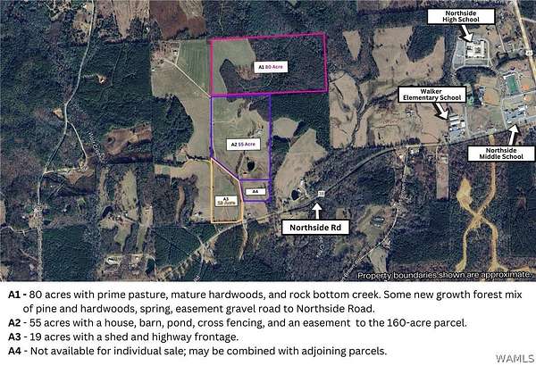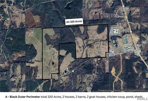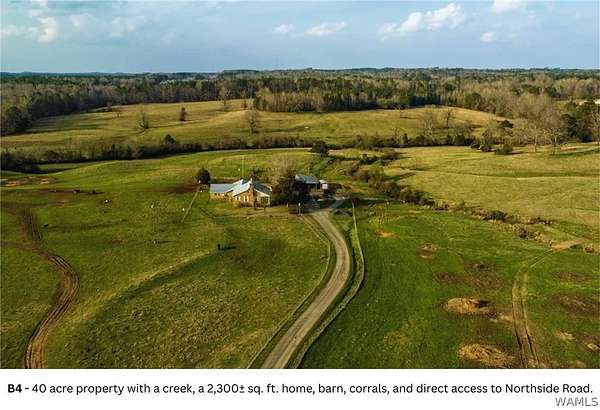 Barbee Creek Preserve is a rare 320+/- acre offering in Northport, AL, located adjacent to Walker Elementary and Northside Middle & High School. This beautiful property features a mix of rolling pastures, hardwoods, creeks, ponds, and multiple barns/homes, and is currently being used as a working cattle farm. The property is being offered as a whole 320-acre tract, but the Seller is also open to selling in smaller parcels depending on buyer preference. Marketing materials and photos may show proposed parcel divisions labeled A1, A2, A3, B1, B2, B3, and B4; however, these are for illustrative purposes only and are not part of a recorded survey. Final parcel boundaries, acreage, access, and easements are subject to Seller approval and a new survey. This is a unique opportunity for a buyer seeking a large recreational tract, homesite potential, investment property, or future development in a prime location within the Northside school zone.
