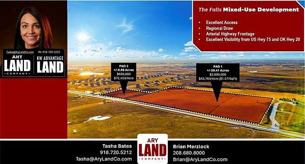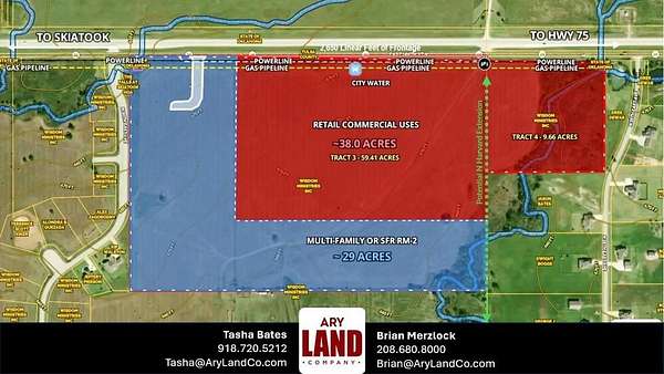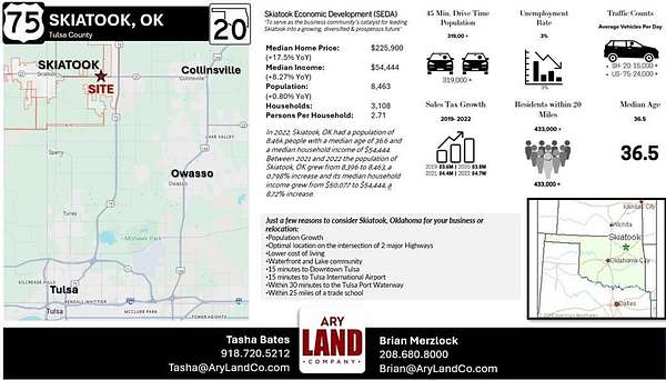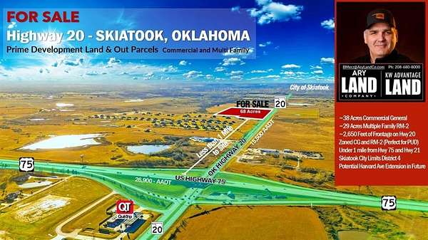 PRIME DEVELOPMENT OPPORTUNITY 69 +/- Acres in Skiatook City Limits! This already zoned commercial property offers an exceptional development opportunity with prime visibility and accessibility. Tulsa County APN: 92328-23-28-45210 (9.66 acres) and 92329-23-29-14720 (59.41 acres) Situated directly off Highway 20, it benefits from a high annual average daily traffic count of 15,500 with population growth of 0.8% per year. The property is strategically located less than one mile from US Highway 75, providing easy access to major transportation routes. The property is fully equipped for development, with city water, electric, and gas readily available at the road. Its location is ideal for connecting to key destinations: just 15 minutes to both Downtown Tulsa and Tulsa International Airport, 30 minutes to the Tulsa Port Waterway, and within 25 miles of a trade school to support workforce development. Skiatook is a thriving community experiencing steady population growth. It features a public school system with high marks, a lower cost of living, and a lake-centered lifestyle, all of which enhance its appeal. As an up-and-coming town, Skiatook combines the charm of small-town living with the advantages of being just a short drive from a major metropolitan area. The property's location at the crossroads of major highways makes it ideal for a variety of development opportunities, including retail, mixed-use, or industrial projects. Industry-specific incentives are available to further encourage business growth and investment. With its proximity to high-traffic routes, strong local infrastructure, and ample room for growth, this property is an unparalleled opportunity to be part of Skiatook's bright future. Contact us today for more information and to explore the possibilities for this exceptional property.