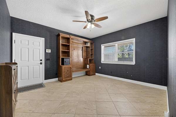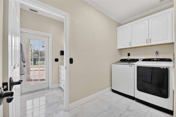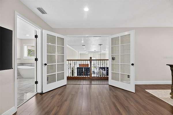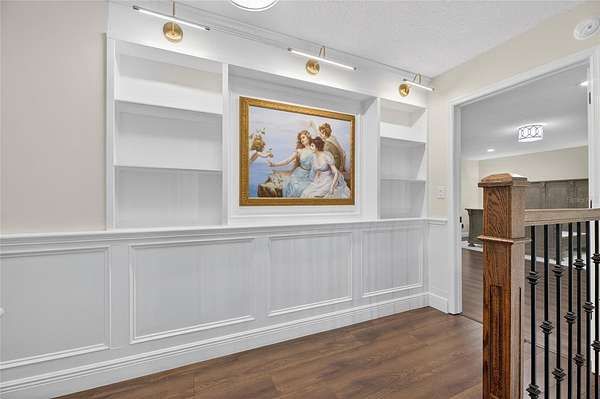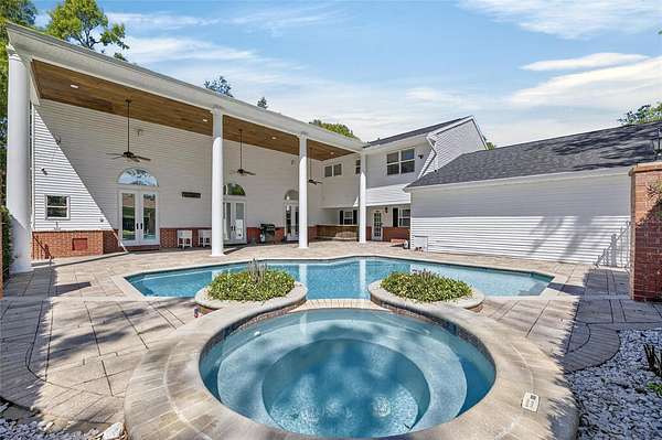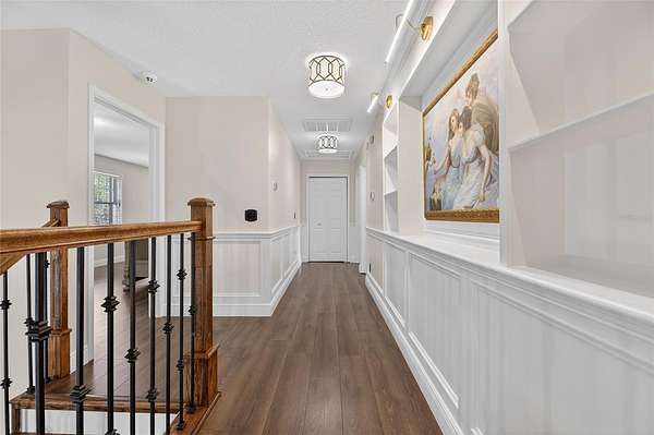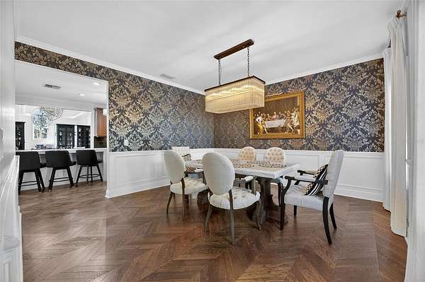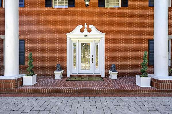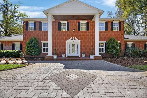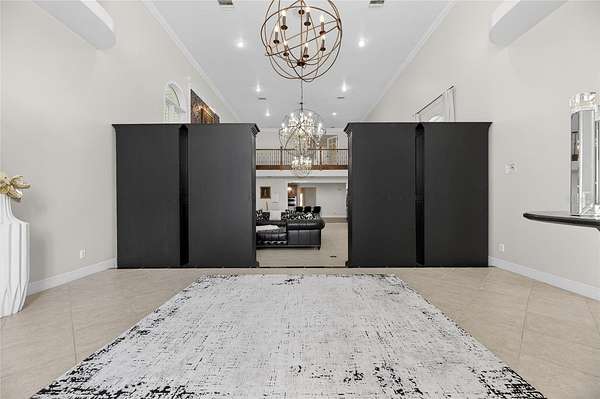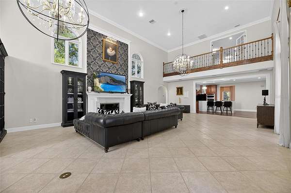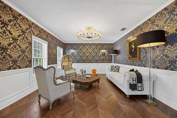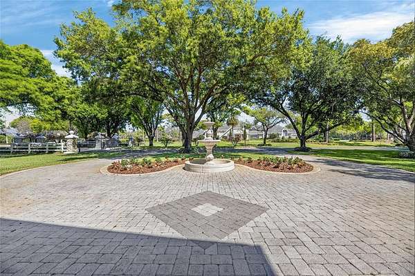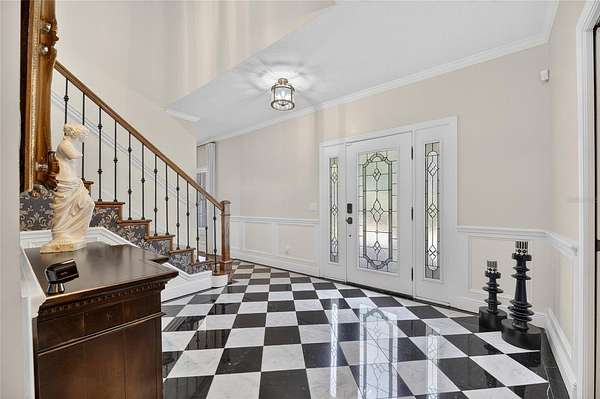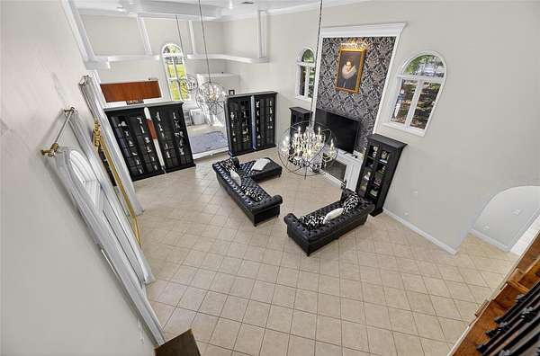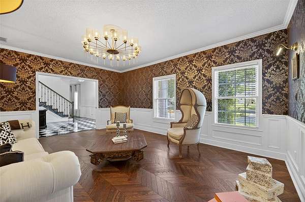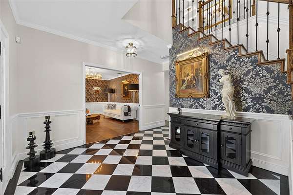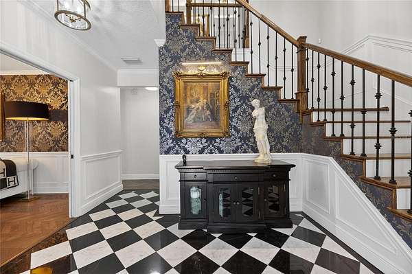 Arrive through a grand circular paver driveway accented by a striking tiered fountain and surrounded by beautifully maintained grounds that create a true estate feel. Inside, the home showcases timeless architectural details including soaring ceilings, crown molding, wainscoting, and a dramatic wrought iron and wood staircase that anchors the grand foyer. Formal living and dining spaces provide an elegant setting for entertaining.