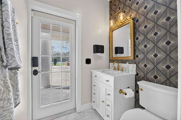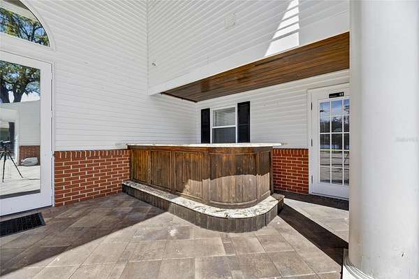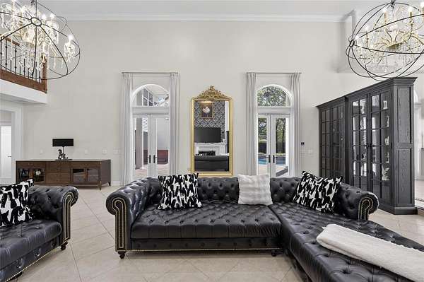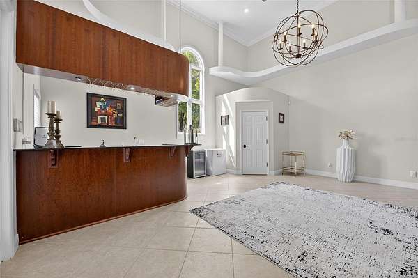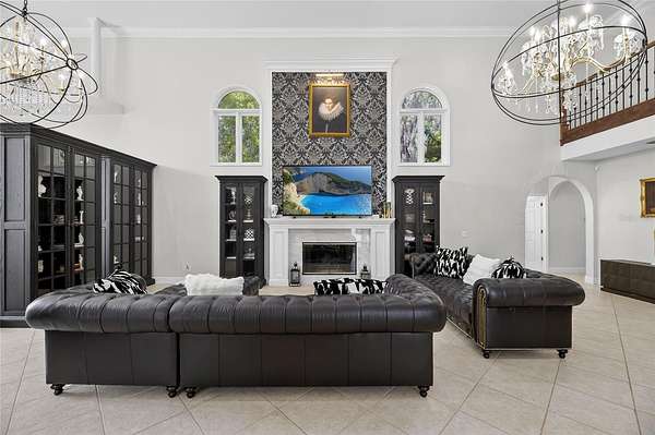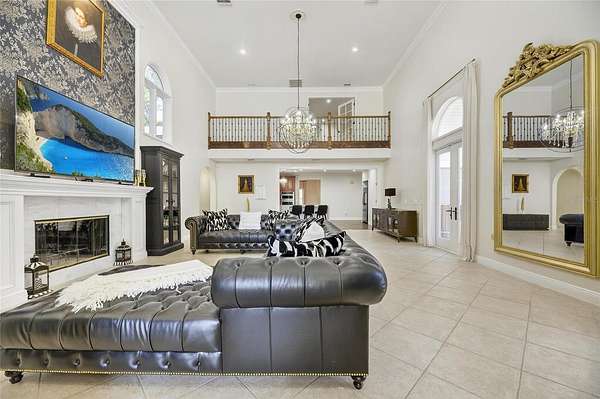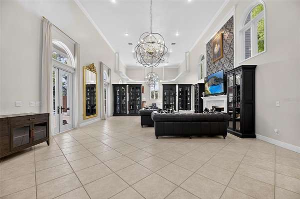 The expansive family and game room is designed to impress, with 20-foot ceilings, a custom media feature wall with a granite fireplace, and a fully equipped wet bar crafted in rich wood tones. A wall of French doors opens to the lanai, creating seamless indoor-outdoor living.