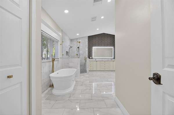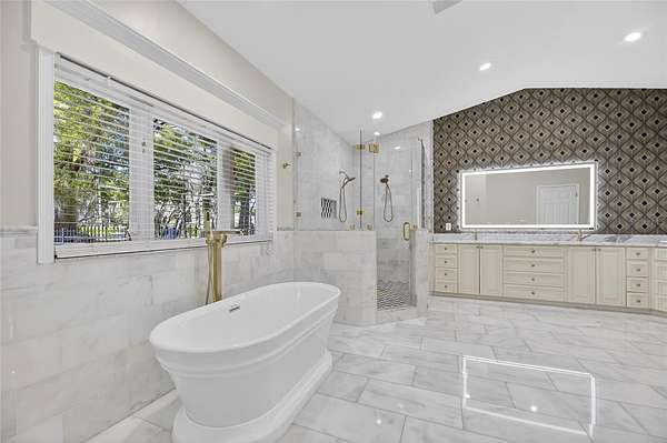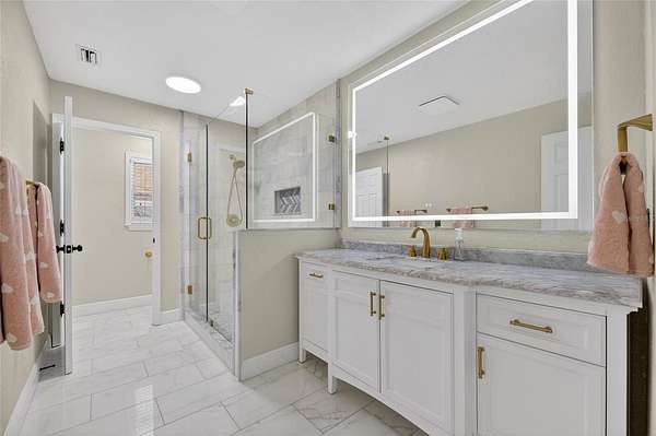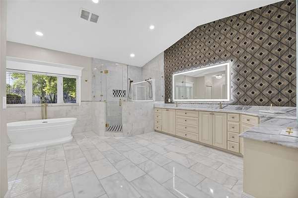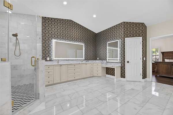 The main-level primary suite offers a private retreat with a spa-like feel, highlighted by a fully renovated bathroom (May 2023) featuring marble floors, a redesigned shower, updated fixtures, and custom dual vanities. Upstairs, a secondary suite with its own living area provides ideal accommodations for guests or multi-generational living, along with additional spacious bedrooms connected by a Jack-and-Jill bath—all bedrooms offering walk-in closets.