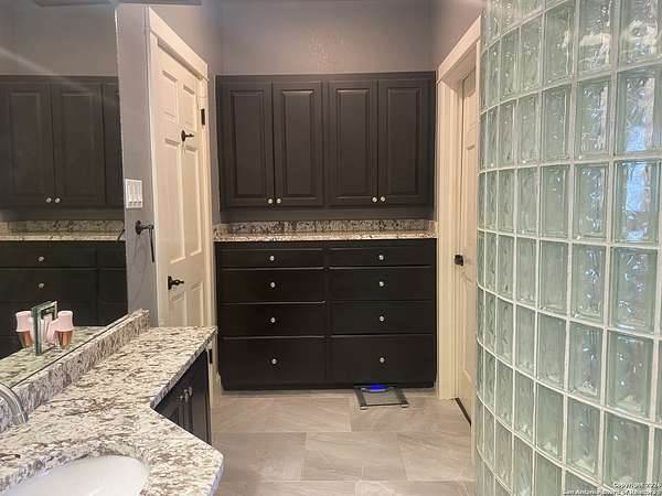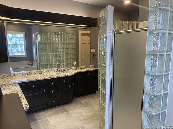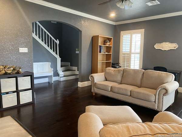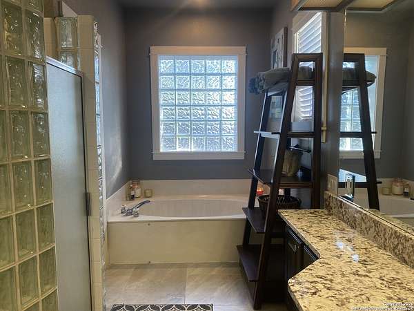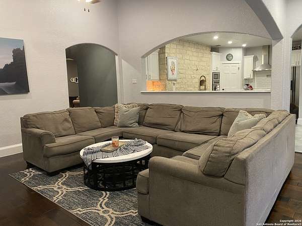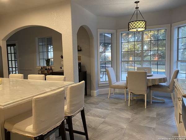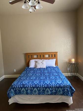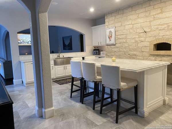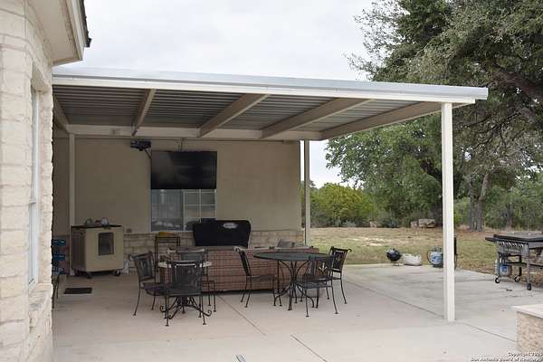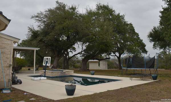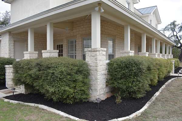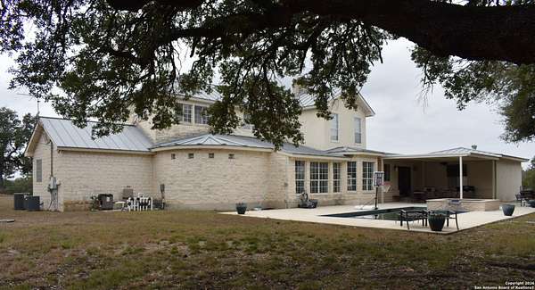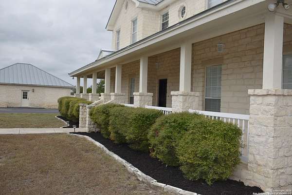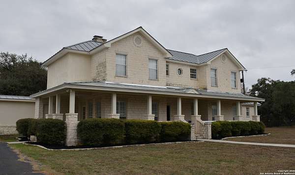 Stunning Hill Country property ideal for Multi-Generational Living on 5 Gorgeous Acres! Complete with TWO Beautiful Homes! This Beautiful compound boasts stunning curb appeal, sitting majestically atop a breathtaking property reminiscent of an elegant Hill Country estate. A private 1/8-mile winding driveway leads to the beautifully updated 4BR/3.5B main house (3,200 sq ft), and 2BR/1B Detached Guest House 1500 sq ft ). Quality built of cut limestone, the Main home features a wraparound porch and durable metal roof. The main residence greets you with 20ft+ ceilings in the entryway, crown molding throughout, and 6 inch baseboards. It offers a true gourmet kitchen with a built-in brick pizza oven, marble countertops, large island, tile backsplash, farmhouse sink, pot filler, stainless appliances, built in wine refrigerator and custom cabinetry, all flooded with natural light. Expansive living areas include a front living room with a true masonry fireplace and refined architectural details such as arches, rounded corners, and Monterey texture throughout. Real wood floors grace the common areas, with tile in baths and utility and carpet only in the upstairs bedrooms. Plantation shutters add timeless elegance. Every bathroom features beautiful granite or quartz countertops. A large bonus room off the primary suite-originally designed as a grand closet-now serves as a flexible space ideal for an office, study, or sitting room. Nearly every downstairs window captures stunning views of the Beautiful Custom Pool and spillover spa (2021), it's even visible straight through the front door. The massive covered back patio opens directly to the pool area, surrounded by ample concrete decking for relaxing and entertaining. The spacious secondary dwelling is a 2BR/1B single story guesthouse (1,500 sq ft) with Full Island Kitchen. ( All interior guesthouse photos are the ones with tan walls ). It is filled with natural light and showcases high ceilings, arched entries, Monterey texture, crown molding, and 4" baseboards throughout. Beautiful ceramic tile flooring runs wall-to-wall, zero carpet. A wide entry flows into the gorgeous island kitchen with granite countertops, tile backsplash, and walk-in pantry. The oversized living room offers abundant space for entertaining. A broad hallway connects both bedrooms and incorporates the laundry area, with Full Washer/Dryer Hookups. The bathroom features a custom walk-in shower, antique vanity, and vintage-style fixtures. This Guest House is ideal for extended family living independently or income producing use. This is not a modern 2026 build cookie-cutter tract home. It is a thoughtfully renovated farmhouse-style compound full of character, craftsmanship, and soul-perfect for those seeking authentic Hill Country living. The fully fenced property has countless majestic oak trees, all cedar cleared, and backs to a private 300-acre ranch for exceptional privacy. Additional features include a large sport court behind a 6-ft stucco wall connecting the homes, a private well (no water bills), NO HOA!!! Bring your Horses! It even has a well house that matches the main residence. Located on a quiet no-thru-traffic road, this extraordinary Hill Country retreat offers peace, privacy, and convenience-approximately 20 minutes to The Rim, Hwy 281 & FM 46, and Blanco Rd.& Loop 1604. COME SEE THIS BEAUTY, READY TO MAKE A DEAL!