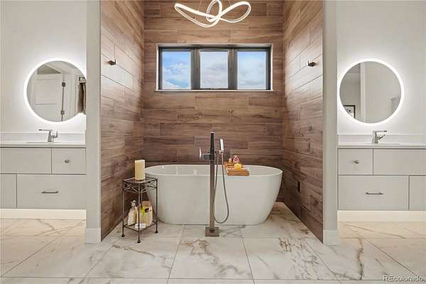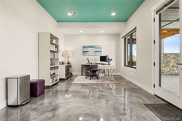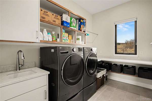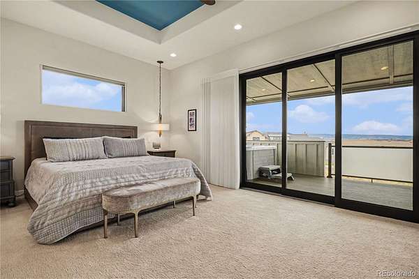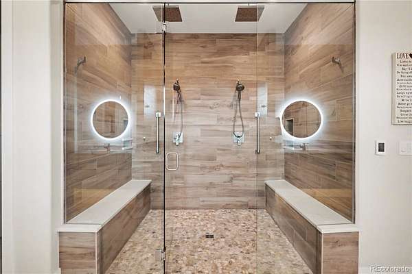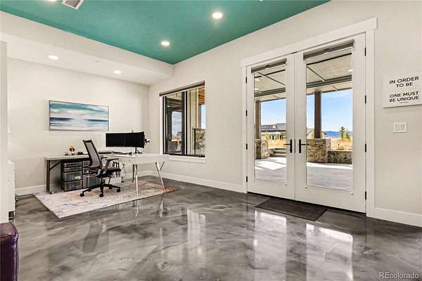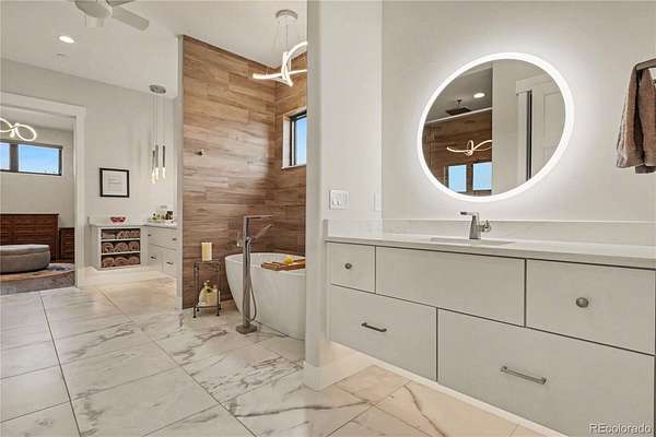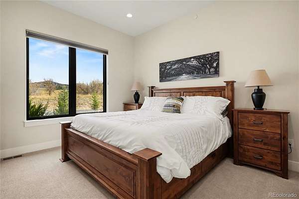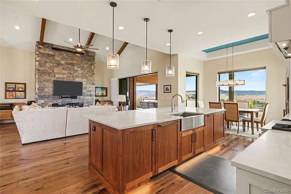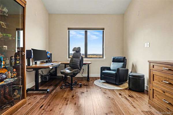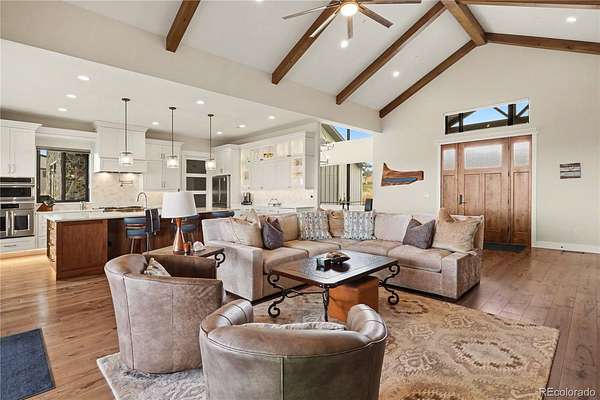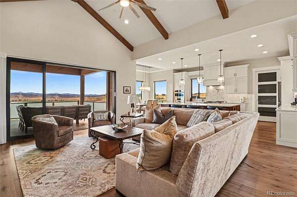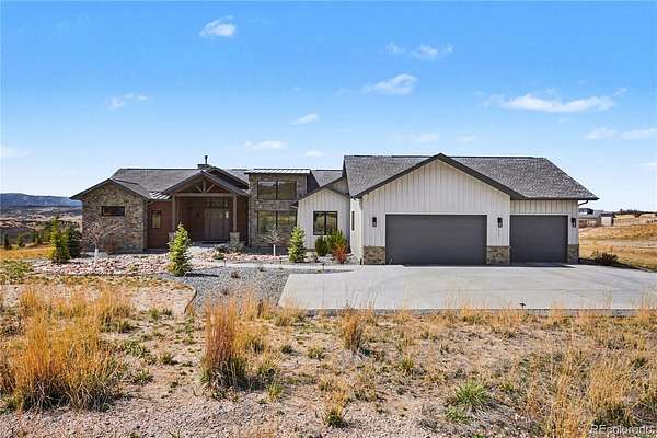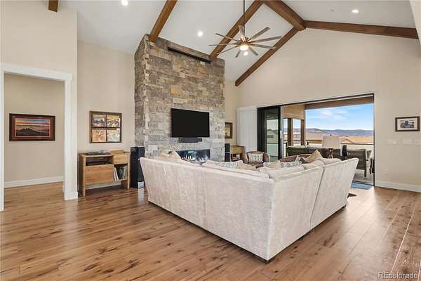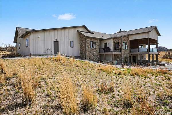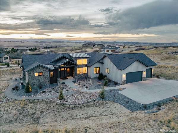 MOUNTAIN VIEWS & LUXURY FINISHES: Set on 2.5 elevated acres in Steven's Ranch, the newest area of coveted Bell Mountain Ranch, this 2022 modern mountain estate captures sweeping views of rolling meadows and peaks from nearly every room. Striking stone exteriors and professional landscaping set the tone for intentional design and quality craftsmanship. Inside, a dramatic entry showcases soaring vaulted ceilings, exposed wood beams, wide-plank hardwood floors, and a statement stone linear fireplace with customizable ambient lighting. A sliding glass wall blends indoor and outdoor living, while powered shades and designer finishes elevate every space. The chef’s kitchen features crisp white cabinetry, an oversized wood island with rare leathered granite, stone countertops, and a luxury appliance suite with pot filler. Highlights include glass display cabinets, under-cabinet lighting, wine and beverage refrigeration, and a walk-in pantry with custom shelving and direct deck access. Outdoor living shines with a vaulted covered deck, radiant heaters, retractable glass walls, and pre-wiring for full-screen enclosure. A private hot tub terrace off the primary suite and a lower covered patio create a true resort-style setting. The primary retreat offers coffered ceilings, pendant lighting, a sliding glass wall with western views, and a spa-inspired bath with heated floors, dual floating vanities with under cabinet lighting, dual-head shower, soaking tub, and two Toto washlet bidet water closets. A custom walk-in closet completes the suite. The walkout lower level includes 848 finished sq ft plus 2,391 sq ft ready for expansion, ideal for additional ensuite bedrooms or multi-level living. A dedicated safe room adds peace of mind. Complete with a 1,524 sq ft heated 4-car garage featuring high-lift doors, side-mount openers, 50-amp EV prewire, and private interior access, this is Colorado luxury living at its finest. Make sure to see this one, you will be mesmerized!