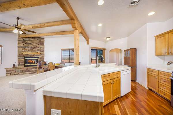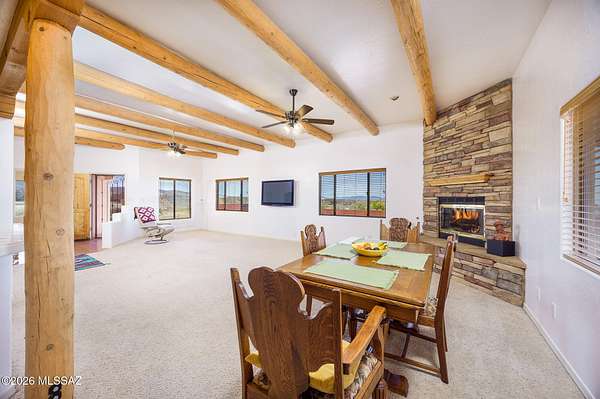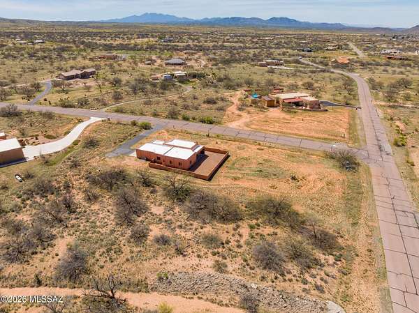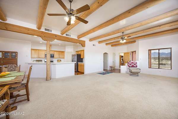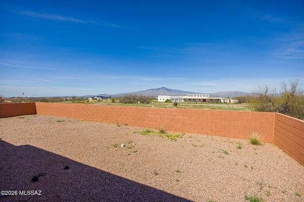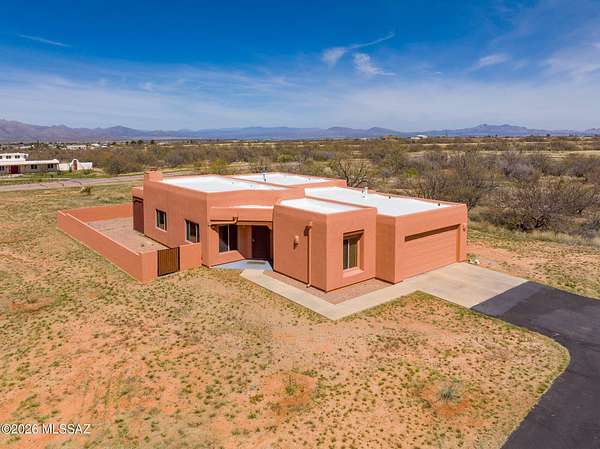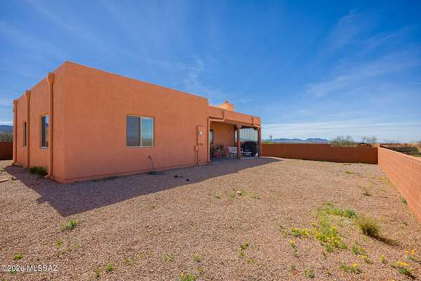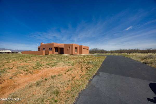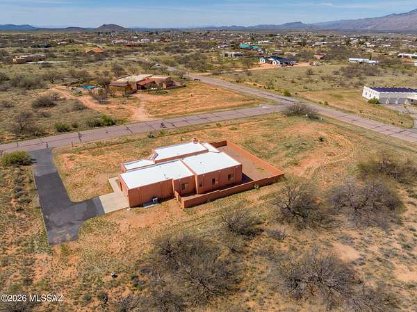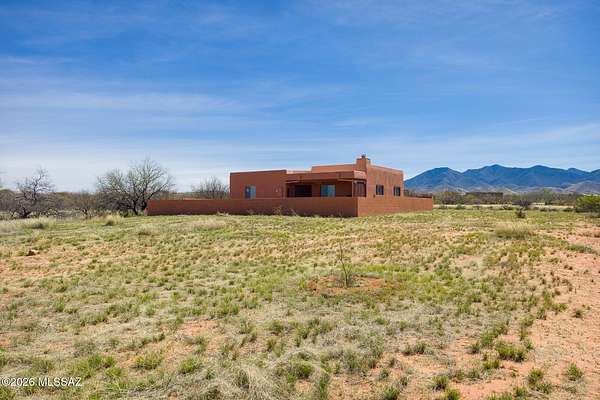 Experience the ultimate desert serenity with this stunning 3-acre property in the prestigious Red Hawk at J-6 Ranch. Situated at an elevation of 4,345 feet, you'll enjoy noticeably cooler summers and unparalleled stargazing under pristine night skies. This 1,809-square-foot ranch home features a thoughtful open-concept floor plan, highlighted by a cozy corner fireplace and rustic wood beams that create a warm, lodge-like ambiance. The interior offers 3 spacious bedrooms and 2 full bathrooms, while custom wrought-iron doors provide both security and style. Step outside to a walled backyard that overlooks a scenic grove of mesquite trees, perfect for quiet reflection or entertaining. Combining country privacy with modern comfort, this is a rare opportunity for peaceful living in Benson.
