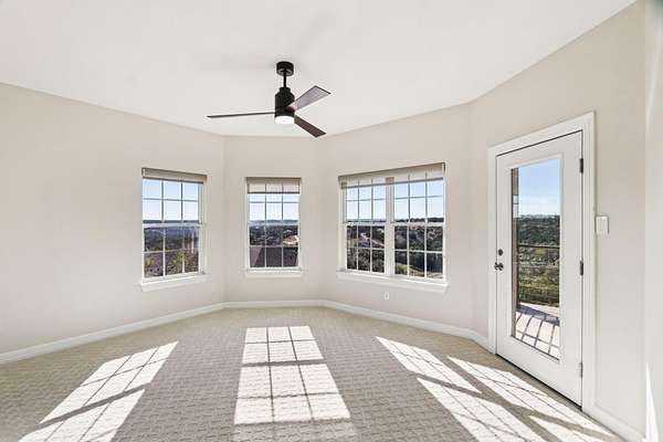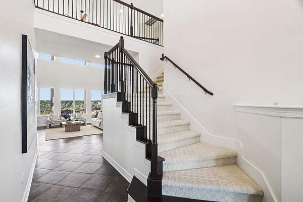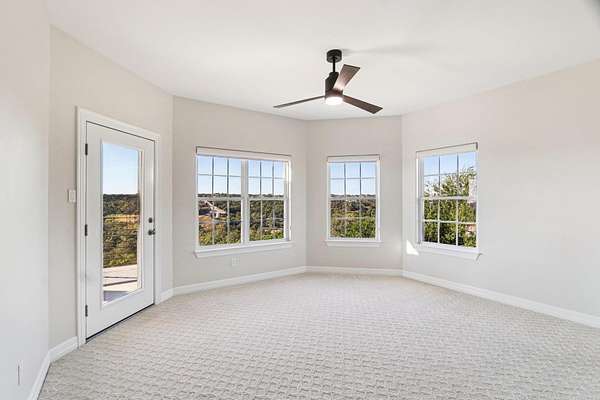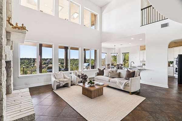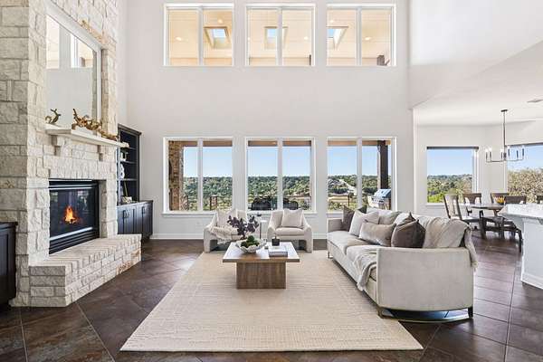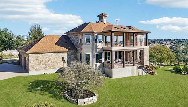 Located in the prestigious Grand Mesa section of Crystal Falls-one of Leander's most sought-after golf-course communities-this custom luxury home sits on an elevated 2.5-acre lot with breathtaking panoramic Hill Country and sunset views from nearly every room. Offering the perfect blend of privacy, elegance, and convenience, it's just minutes from top-rated Leander ISD schools, shopping, walking trails, and Hwy 183. Over $100K in thoughtful updates which showcase pride of ownership, including a recent roof, custom sandstone retaining wall, and lush front landscaping with elegant white limestone accents framing the trees and garden beds.Upon entry through the grand 2-story foyer, the Hill country picturesque view is instantly presented through walls of windows spanning across the soaring 2-story living room and stone fireplace, together with the dining room, updated gourmet kitchen with adjoining Media/Flex room, in this open flexible floor plan attracting abundant natural light. Next to the foyer, is an office with double-French door, versatile for work, leisure, and possibility of a 4th bedroom. Multiple covered porches, patios, and a balcony create seamless indoor-outdoor living-perfect for morning coffee, sunset dinners, or quiet reflection. The expansive backyard offers ample room for a future pool or guest house, with no front or back neighbors ensuring exceptional privacy. The main-level primary suite is a serene retreat with dual vanities, soaking tub, walk-in shower, and spacious walk-in closet, plus wrap-around windows and a private patio door to enjoy stunning views. Upstairs 2 bedrooms with private baths and walk-in closets have abundant windows and private balcony doors for enjoying views on the balcony with 3 skylights. Schedule your private showing to experience the luxury, space, tranquility of Hill Country custom view estate in Grand Mesa's premier lot - complete with resort-style amenities, trails, parks, and award-winning Crystal Falls Golf Club.