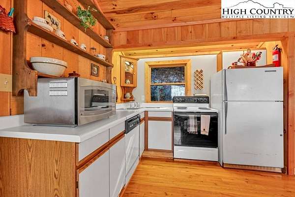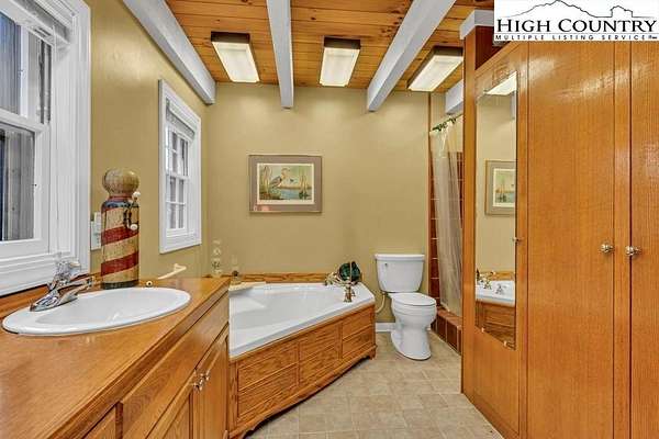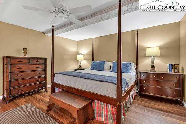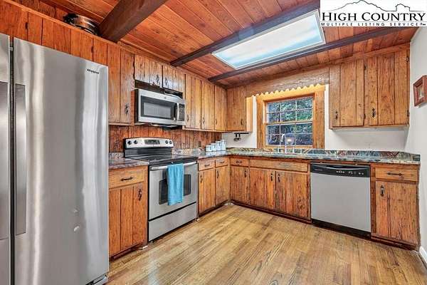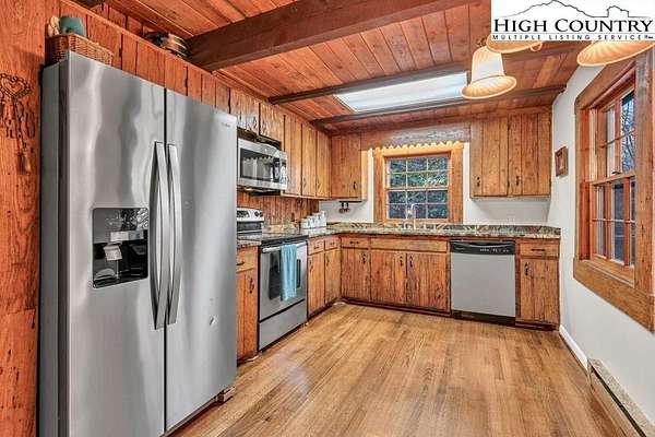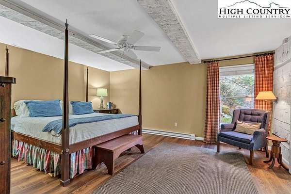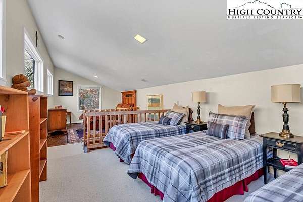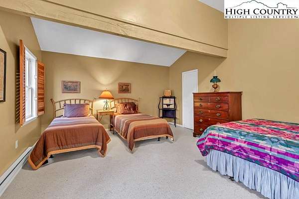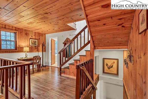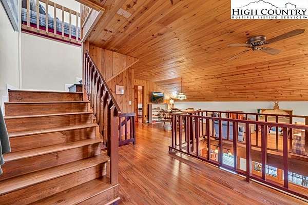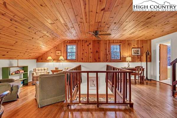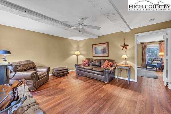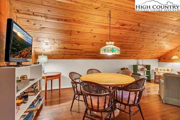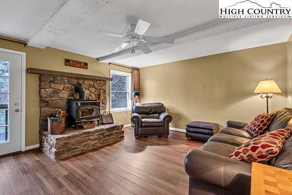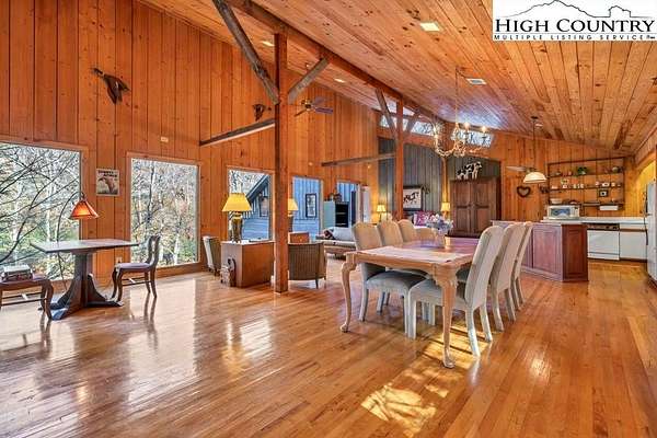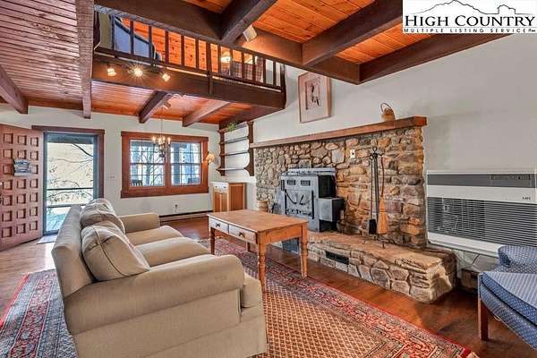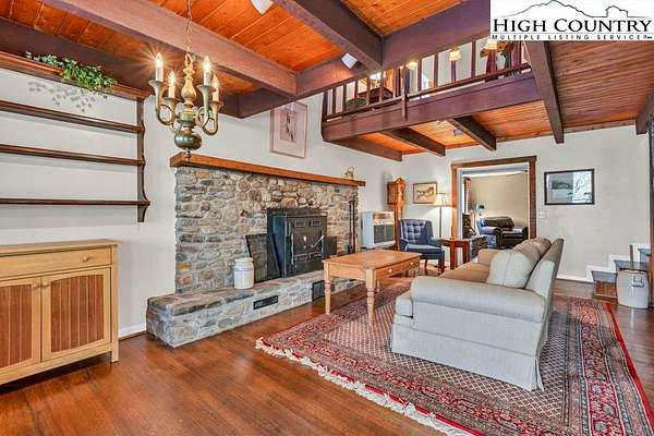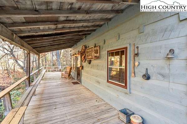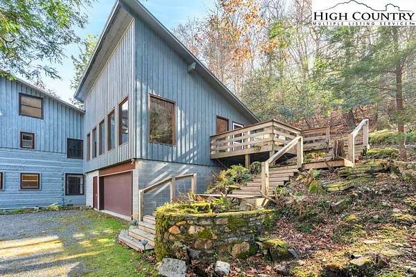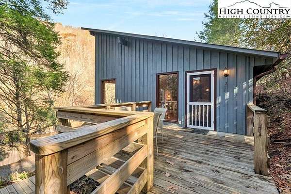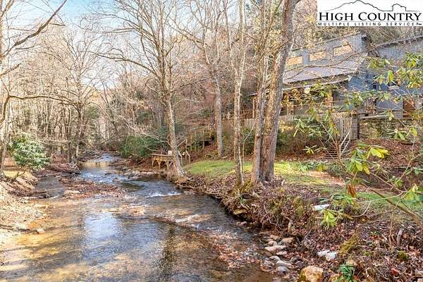 Escape to a Mountain Haven on Howards Creek, where timeless charm meets modern comfort. This one-of-a-kind property offers nearly 400 feet of pristine creek frontage, ideal for fishing and recreation, located on 3.9+ private acres, just minutes from downtown Boone. Featuring a beautifully crafted main home and a separate studio apartment, the property spans over 4,400 square feet of living space and is being offered furnished with a few exceptions. Short-term rentals permitted, this distinctive retreat presents a rare opportunity for both personal enjoyment and income potential. A brand-new bridge, completed in July 2025, provides convenient, year-round access via state-maintained, paved roads. The home's picturesque setting includes expansive decks overlooking Howards Creek, a tranquil pond, and wooded privacy--all creating an atmosphere of peace and natural beauty. Designed for effortless mountain living, the main level features an updated kitchen with stainless steel appliances and classic wormy chestnut cabinetry, an inviting living room and den--each with stone fireplaces and woodstoves--a spacious primary suite with a soaking tub and walk-in closet, and a half bath. Upstairs, the second floor offers a large open bonus area, two generous bedrooms, and a full bath. The third level, filled with light, serves as an additional sleeping or lounge area, with large windows framing the surrounding landscape. Outdoor living is enhanced by a wide covered porch overlooking the pond and creek, complete with steps leading directly down to the water's edge. The separate vaulted studio apartment includes a full kitchen and bath, ideal for guests, family, or rental use. Additional highlights include an oversized two-car garage, high-speed fiber-optic internet, and a gentle grade to the creek for easy access. Situated at a cool 3,600+ feet in elevation, this property offers comfortable year-round living and the true essence of mountain tranquility. The sellers note that the home has never flooded. A new metal roof is scheduled for installation in October 2025, and final grading with gravel around the new bridge will be completed in late August 2025. Blending rustic character, thoughtful updates, and investment versatility, this is a rare offering--where the sound of rushing water, mountain air, and timeless craftsmanship create a retreat unlike any other.