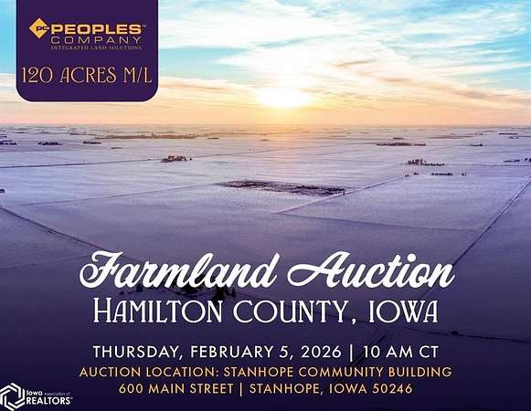 Hamilton County, Iowa Land Auction – Mark your calendar for Thursday, February 5th, 2026, at 10:00 AM! We are pleased to be representing the Clifford L. Johnson Farm in the sale of 120.00 acres m/l located approximately 3 miles northeast of Stanhope, Iowa. This high-quality Hamilton County, Iowa farm consists of 117.14 Non-Highly Erodible FSA cropland acres, of which 99.70 are currently in row crop production carrying a CSR2 average of 71.1. The balance of the 17.44 FSA cropland acres are currently enrolled in CRP programs CP27 & CP28, producing an annual payment of $5,232. Farm Lease: The farm is leased for the 2026 crop season, and the Buyer will assume the 2026 farm lease. The total cash rent for the 2026 year is $26,919 and is paid in three equal payments. The first payment of $8,973 is paid on March 1st, 2026, and will appear as a credit to the Buyer at closing. The final two payments will be made directly to the Buyer with the second payment of $8,973 being made on September 1st, 2026, and the third payment of $8,973 being made on November 15th, 2026. Please reach out to the listing agent for more details. The single tract will be offered on a price-per-acre basis via Public Auction and will take place on Thursday, February 5th, 2026, at 10:00 AM at the Stanhope Community Center in Stanhope, Iowa. This auction can also be viewed through a Virtual Online Auction option, and online bidding will be available. Visit our website for more information.