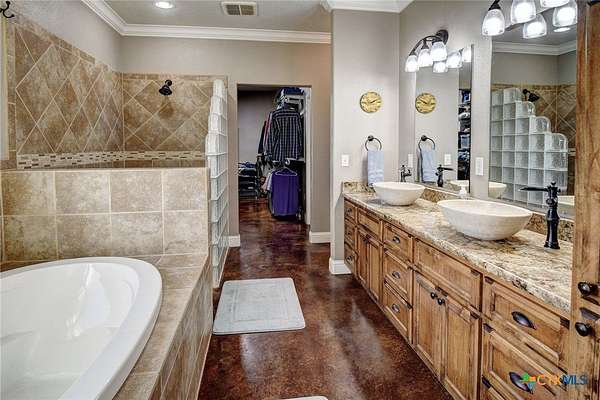 - Attic, Beamed Ceilings, Built In Features, Cathedral Ceilings, Ceiling Fans, Crown Molding, Double Vanity, Game Room, Garden Tub Roman Tub, High Ceilings, Home Office, Living Dining Room, Main Level Primary, Pantry, Primary Downstairs, Pull Down Attic Stairs, Recessed Lighting, Separate Shower, Soaking Tub, Split Bedrooms
