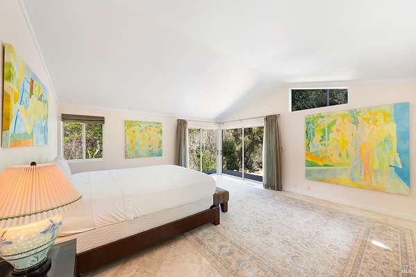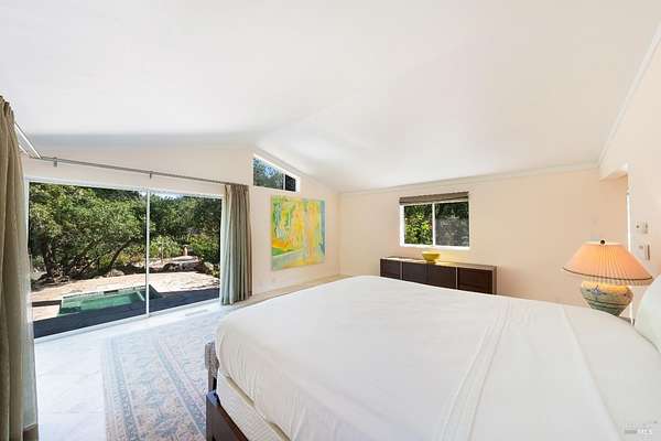 Mid century style home in a story book garden setting surrounded by lush nature, large swimming pool, vineyards and multiple garden vignettes for enjoying the outdoor space. Private, quiet, filled with natural light 2 bedroom 2 bathroom main home with a spectacular master suite. Separate second unit offers a generous studio space with a full bath that could be used as a multipurpose unit. Double glass doors facing garden with pool allows maximum natural light. Main house first floor offers separate living and dining rooms, wood burning fireplace, office space with one of a kind desk and tables, vaulted ceilings, gourmet kitchen, screened in porch, one bedroom, full bath, laundry and wine cellar basement. Second story takes you on a glassed walkway leading to master bath and bedroom. Master bath is ample with multiple wall to wall glass mirrored closet space, large glass shower with picture window looking onto nature and access to spa from master bedroom. If you are looking for privacy and a beautiful retreat this is the place to be, located a few minutes away from the town of Calistoga and all it has to offer, a true gem.