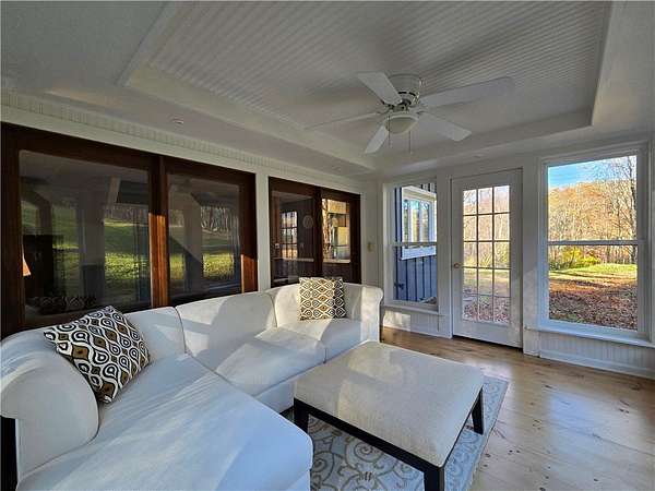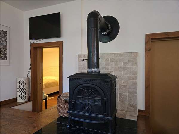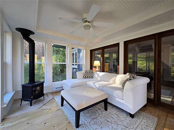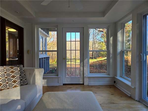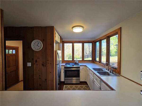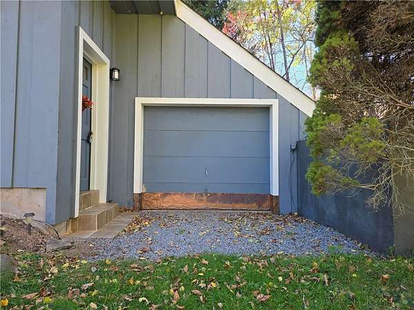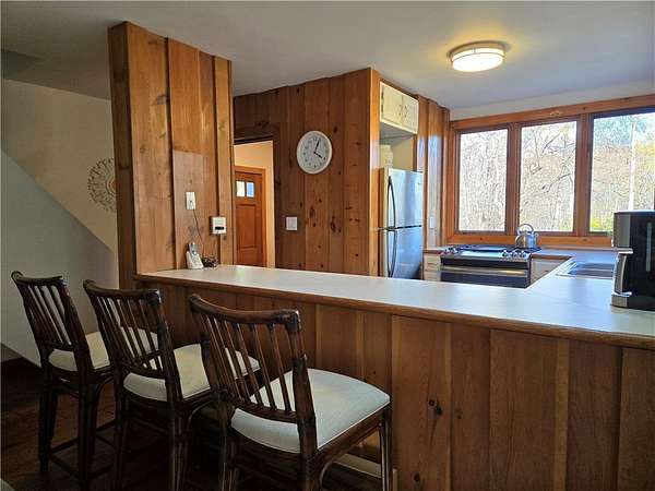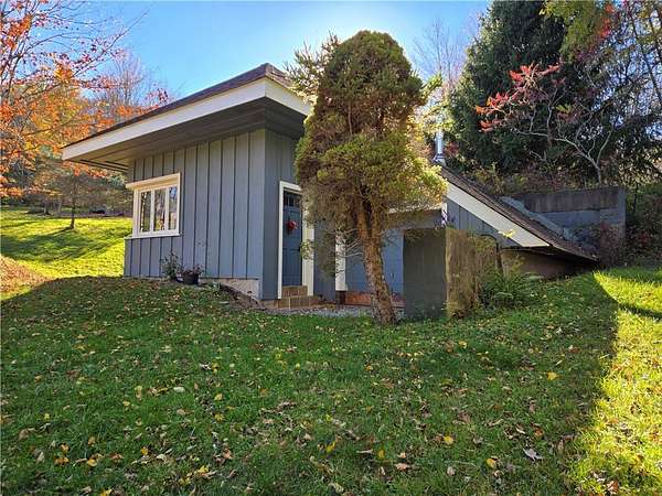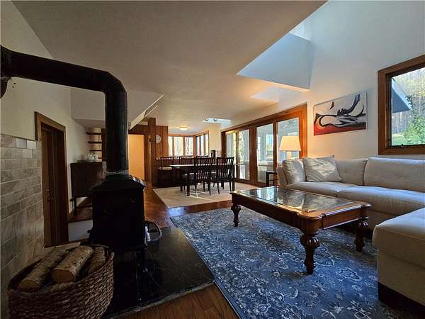 Tucked away at the end of a private road, this contemporary-style home perfectly blends modern comfort with the peaceful charm of country living. Set on 5 scenic acres, the property borders over 340 acres of NYC-owned land, offering endless opportunities for hiking, hunting, and exploring right from your backyard. A gentle stream winds through the property, filling the air with the soothing sound of flowing water and creating a truly tranquil setting. Inside, the home welcomes you with a bright, open layout and thoughtful updates throughout. Enjoy the warmth of two cozy wood stoves, beautiful new hardwood floors, and fresh exterior paint. The home also features a newer roof and skylights, along with an updated hot water heater and filtration system. The main bedroom is conveniently located on the first floor, providing comfort and ease for year-round living. An attached garage adds convenience and extra storage, perfect for keeping your car protected or stowing outdoor gear after a day of adventure. With high-speed internet, a 200-amp electric panel, and plenty of inviting spaces to relax or entertain, this home offers the ideal balance of practicality and serenity. Whether you're searching for a full-time residence or a peaceful weekend escape, this property captures the essence of Catskills living, privacy, nature, and the gentle sound of a stream just beyond your door.