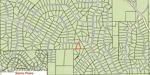 Est $1,418/moOne of the best remaining lots in Sierra Pines! This elevated, private homesite is surrounded by beautiful pines and oaks, offering both serenity and natural beauty. Save significantly on building costs with a level, buildable lot -- and no grinder pump required. The unique trapezoid shape, combined with neighboring homes set well off the rear property line, creates exceptional privacy. This is truly a must-walk property to fully appreciate its setting and potential.