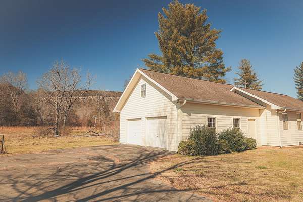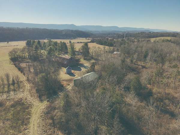 Improvements include a 4,500-square-foot primary residence overlooking pasture, gardens, and barns, serviced by spring and city water, plus a pole barn and historic red barn. A second brick home near the entrance provides guest or caretaker accommodations.