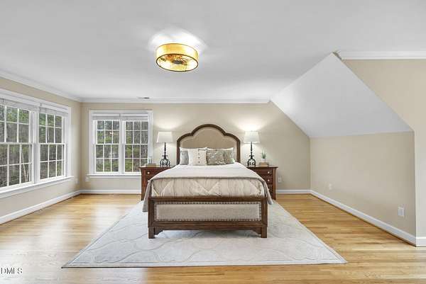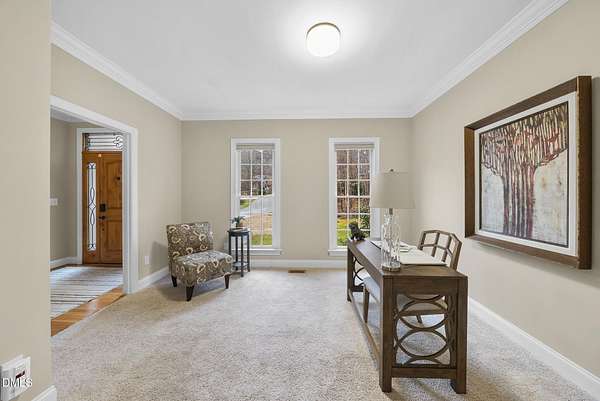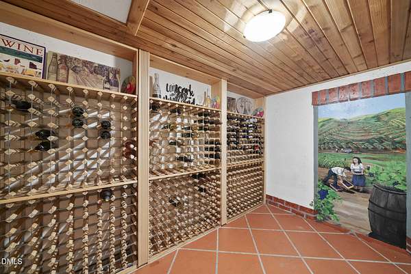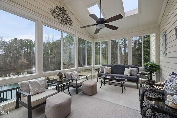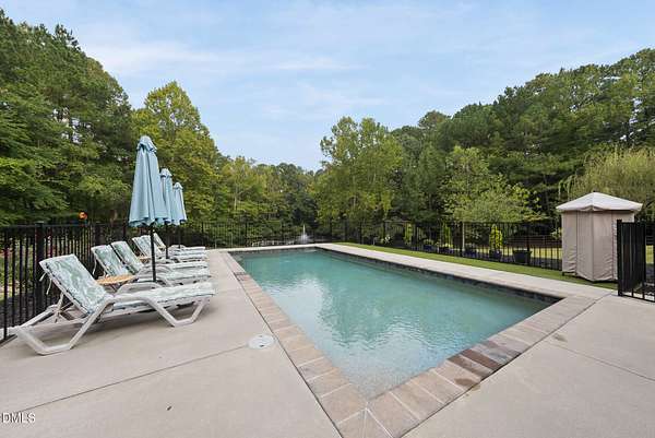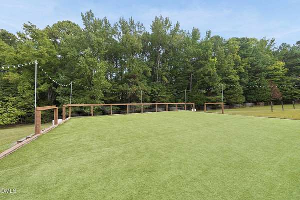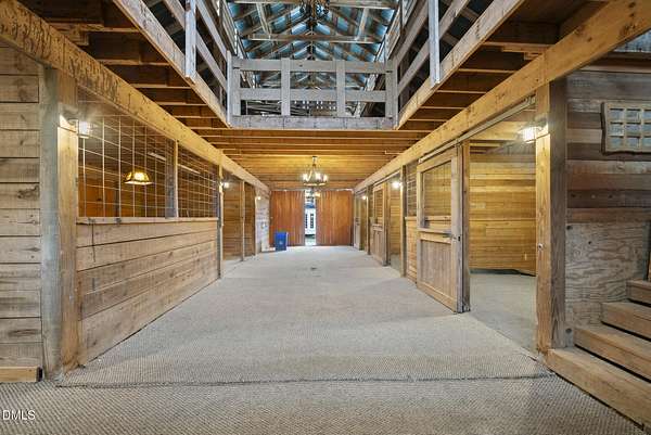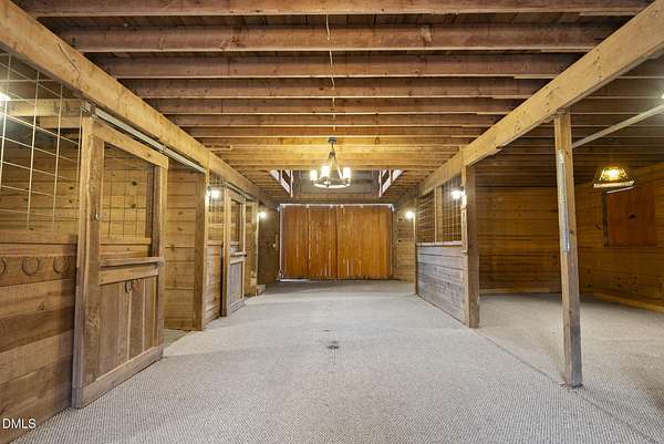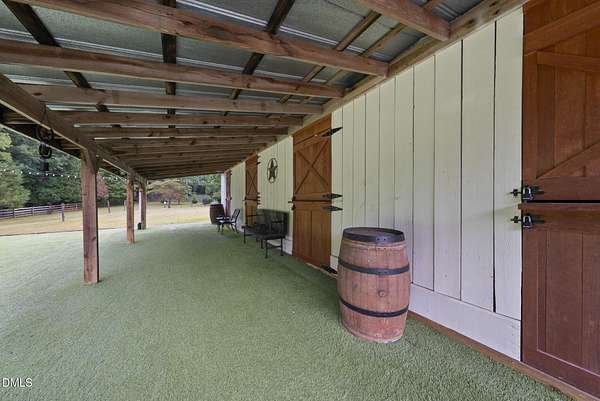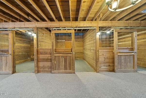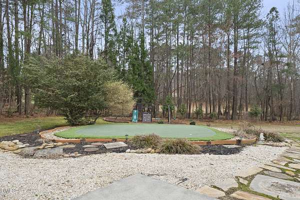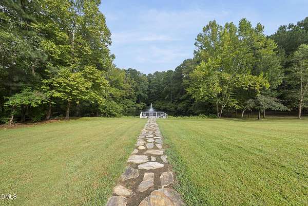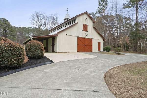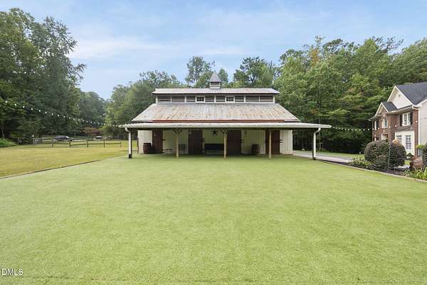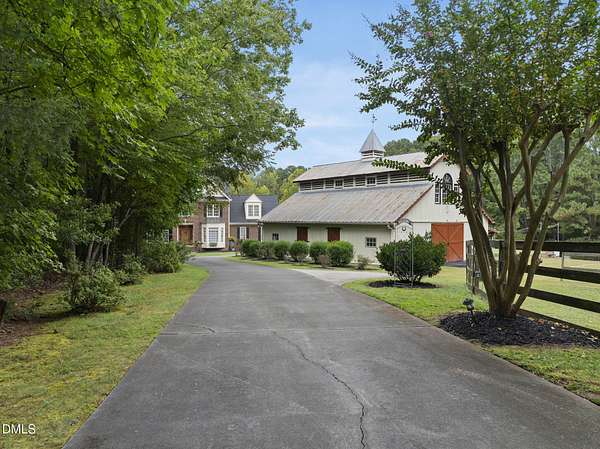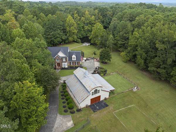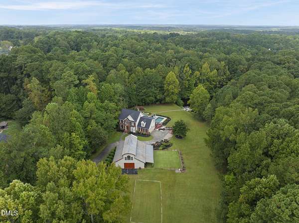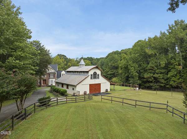 Exquisite custom home by Charles Grantham sits on over 5 private acres, offering the perfect blend of luxury, recreation, and peaceful living! All while being a convenient commute to everything Raleigh has to offer! This horse-friendly property features a charming barn that can serve as an event space, workshop, or equestrian facility! Scenic pond with fountain and dock create a private space perfect for relaxing and entertaining!. Outdoor living shines with a heated saltwater pool, expansive patio and deck, and a beautifully designed miniature putting green! Inside, formal living and dining rooms complement an inviting family room that overlooks the kitchen, creating a bright and open floor plan perfect for gathering and everyday living. The updated eat-in kitchen features stainless steel appliances including double oven range, and a spacious breakfast bar with new granite countertops! The primary suite offers a spa-like bath with dual vanities, glass shower, garden tub, and walk-in closet, while additional bedrooms and a third-floor bonus room provide flexible living space. A walk-out basement with bonus room, office, full bath, flex space, and wine cellar offers excellent potential for an in-law suite or private guest retreat, completing this exceptional property surrounded by mature trees and serene views.