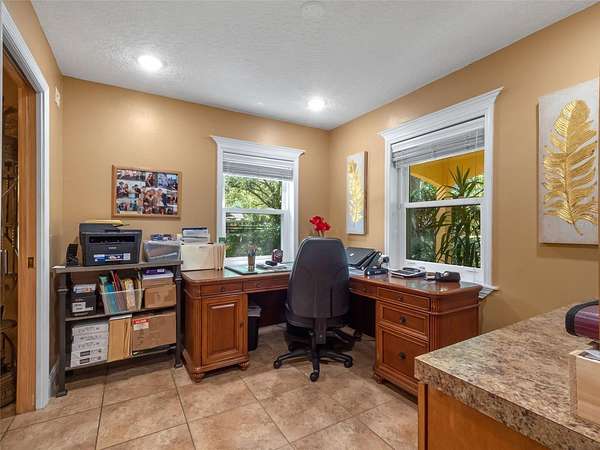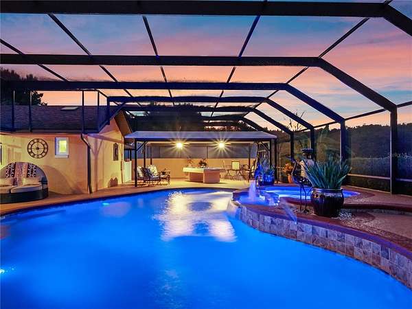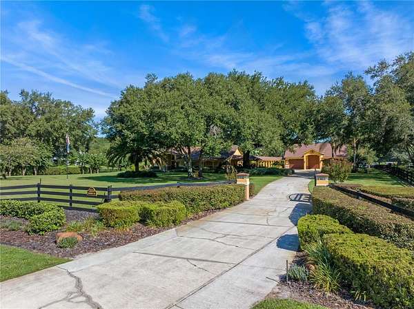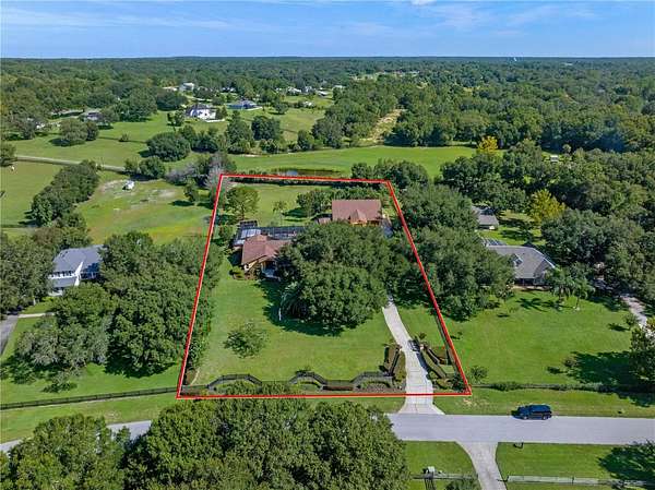 Welcome to 32133 Wolf Branch Lane - a breathtaking custom-built Mediterranean estate set on 2.55 acres in the desirable town of Sorrento. Proudly maintained by its original owners, this exceptional home offers 4 bedrooms, 4.5 baths, a resort-style saltwater pool, and a massive 2,912 Sq. Ft. garage with room for a +/- 45' RV, boat(s), multiple vehicles, toys and more. As you enter the property through the elegant iron gate, you're immediately struck by the perfectly manicured grounds and a majestic 100-year-old oak tree, creating an irreplaceable park-like setting. Inside, the open-concept design seamlessly blends the living room, dining area, and chef's kitchen beneath soaring vaulted ceilings--all with expansive views of the pool. The gourmet kitchen is a true showpiece, featuring a large island with bar seating, custom cabinetry, granite countertops, GE Monogram appliances, butler's pantry with dual refrigerators, wine cellar, and a cozy breakfast nook overlooking the pool. A large PGT sliding glass door leads to the ultimate backyard oasis: a screened-in retreat with a saltwater solar-heated pool, gas-heated spa, spacious covered lanai with dining and lounging spaces, and a separate gaming/BBQ pavilion. All positioned to capture the incredible sunset views and offering an ideal setup for entertaining and family fun! The luxurious primary suite offers a tranquil seating area with an electric fireplace, pool views, dual walk-in closets, and a spa-like bath with dual vanities and walk-in shower. Three additional spacious bedrooms (two with ensuite baths), two private offices, a mudroom, and a dedicated pool bath complete the interior. The oversized garage/shop is a rare amenity--featuring four automatic roll-up doors, 400-amp power, dual 50-amp RV/boat hookups, mezzanine storage rooms, and an air-conditioned flex space perfect for a gym or studio. Other Highlights Include- Half Court Basketball Court, Greenhouse, Fenced Garden Area, Newer Roof (2021), Advanced Security System, Irrigation Well, Well/Pump House, Newer Drainfield, Fully Cross Fenced Property and more! Ideally located just minutes from Hwy 429, this estate offers effortless access to all of Central Florida and the charming downtown of Mount Dora, renowned for its shopping, dining, and festivals. An estate with this combination of luxury, space, privacy, security and amenities is truly a rare find. Schedule your private tour today!