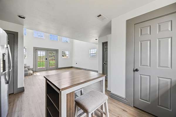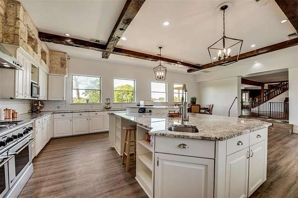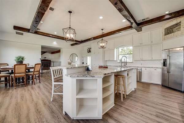 Inside, the main farmhouse features a chef's kitchen complete with a commercial-grade gas range and double oven, accented by beautiful stonework. The large center island offers ample space for gathering with friends and family. Exposed beams and luxury vinyl plank flooring create a warm and inviting flow through the dining area and into one of two living rooms. One living area highlights original hardwood floors and rustic beams, while the other features a cozy wood stove fireplace--ideal for relaxing on cool evenings.