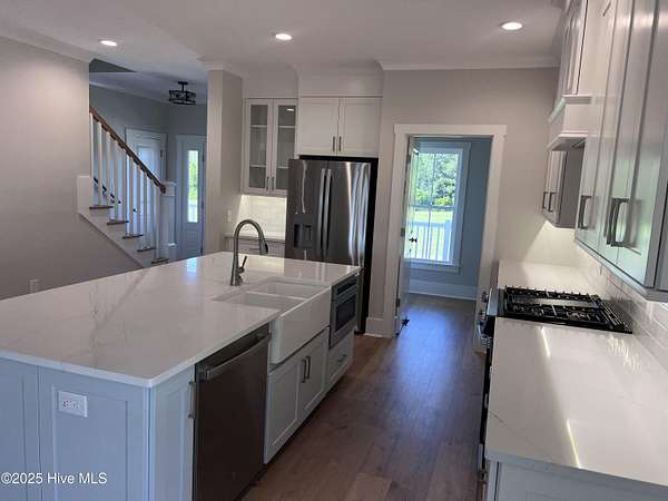 Check out this new construction home built by W.A. Corey Construction. This home is part of the exclusive Beaufort Pointe Community, which features manicured grounds, a neighborhood boat ramp, and a community pier. The open floor plan includes 4 bedrooms and 2.5 baths. The ground level offers parking space and a storage room perfect for your summer toys. The main floor living area includes a large, open kitchen with ample cabinetry, a large island, quartz countertops, tile backsplash, farmhouse sink, and stainless steel appliances. There is also a separate laundry room, LVP flooring, detailed trim work, and a gas fireplace with tile brick surround with built-ins. The first-floor master suite is filled with natural light and includes double doors that walk out to a large screened porch overlooking the backyard. The bathroom features tile flooring, a tile walk-in shower, a freestanding soaking tub, a double sink vanity with quartz countertops, and a walk-in closet. Upstairs, you will find three additional bedrooms with a shared bathroom. This home offers exquisite quality and is the perfect family retreat, less than 30 minutes from Greenville and just 5 minutes from historic downtown Washington.