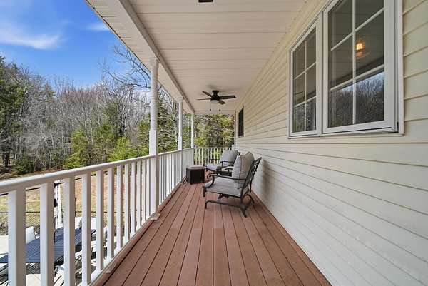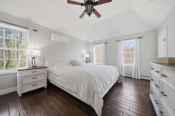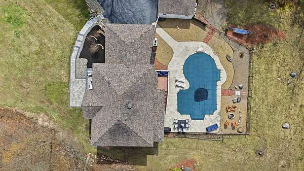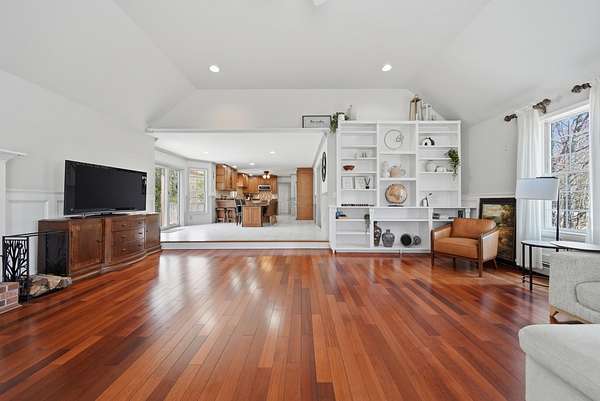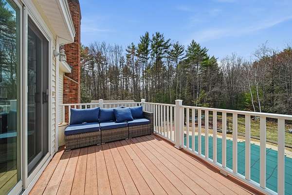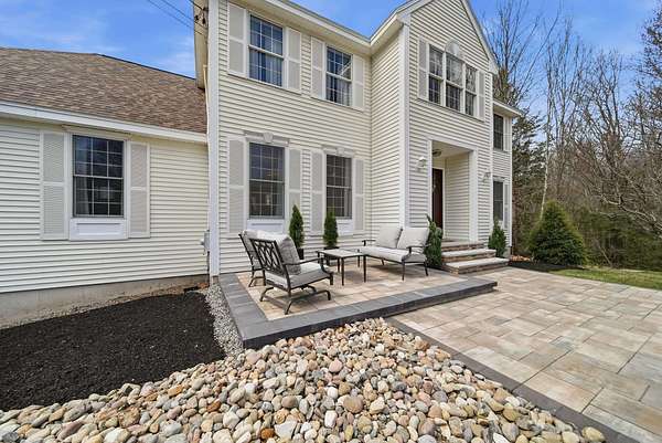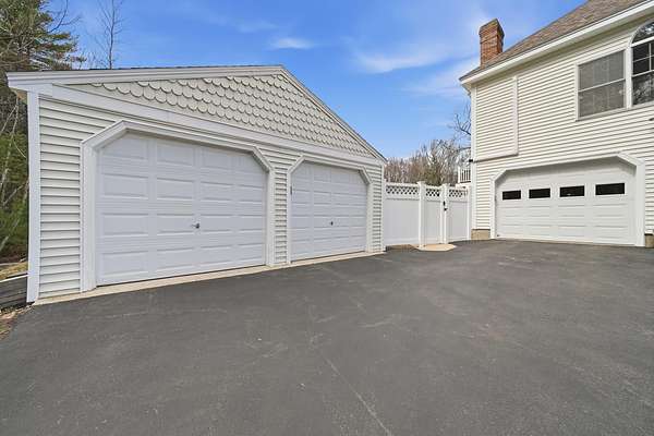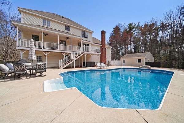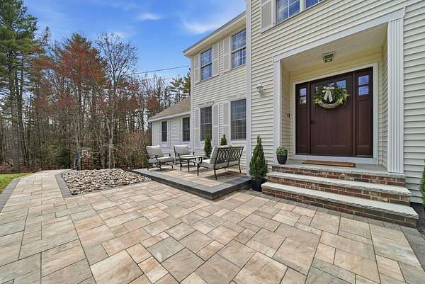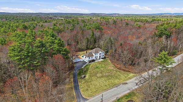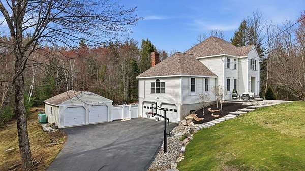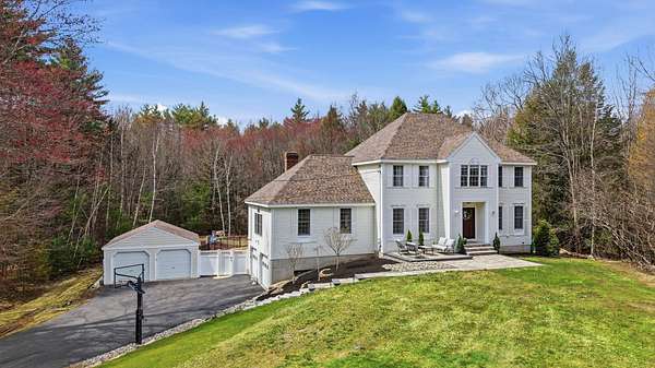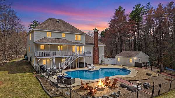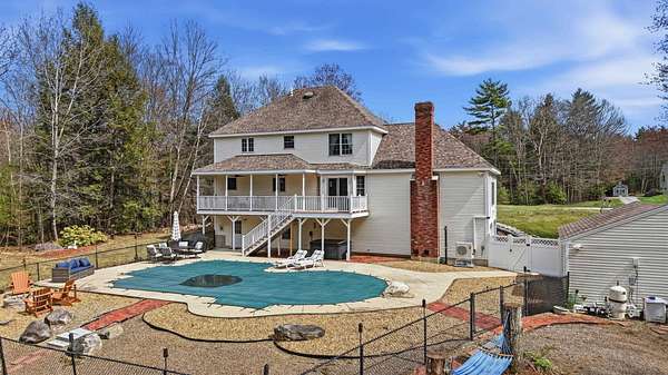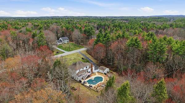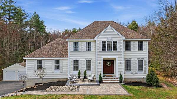This is more than a home - it’s a lifestyle property offering privacy, space, and the opportunity to enjoy every season New England has to offer. Set on over 9 private acres in one of Chester’s most desirable neighborhoods within the Pinkerton Academy district, this meticulously maintained 4-bedroom Colonial offers the perfect balance of space, comfort, and lifestyle. From the moment you arrive, the setting invites you to slow down and take it all in lush surroundings, scenic trails, and a backyard designed for both relaxation and unforgettable gatherings. The heated saltwater in-ground pool, expansive patio, and partially covered deck create a true outdoor retreat, ideal for summer entertaining or quiet evenings overlooking the peaceful landscape. Inside, a welcoming foyer opens to a thoughtfully designed main level featuring hardwood floors and fresh updates throughout. The kitchen is the heart of the home, complete with stainless steel appliances and a custom peninsula for casual dining, flowing seamlessly into a formal dining room and an impressive great room with vaulted ceilings, a wood-burning fireplace, and custom built-ins. A second living area or home office adds flexibility, along with a convenient half bath and laundry. Upstairs, the spacious primary suite offers a private retreat with vaulted ceilings, a walk-in closet, and an ensuite bath with a double vanity and whirlpool tub. Three additional generously sized bedrooms and a full bath complete the second floor. The finished lower level expands your living space with a warm, inviting feel, featuring a gas fireplace, home theater setup, built-in bar, and direct walkout access to the backyard and pool area. Additional highlights include a walk-up attic for future expansion, a water softener system, new mini-splits, updated electrical, smart home features, and abundant storage. Car enthusiasts and hobbyists will appreciate the rare combination of a two-car garage under and a detached two-car garage.