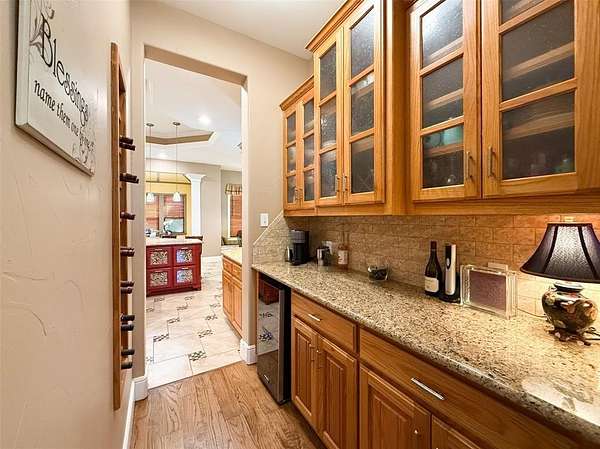 The chef-inspired kitchen features top-of-the-line appliances, a built-in commercial-grade refrigerator, gas cooktop, double ovens, a large center island with breakfast bar, walk-in pantry, and butler’s pantry with wine refrigerator and storage. The kitchen opens to two inviting living areas, including a cozy fireplace family room and an entertaining lounge with wet bar and access to the outdoor living area.