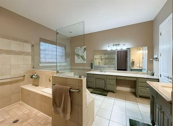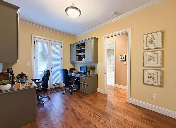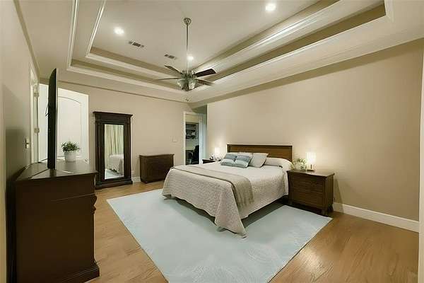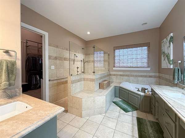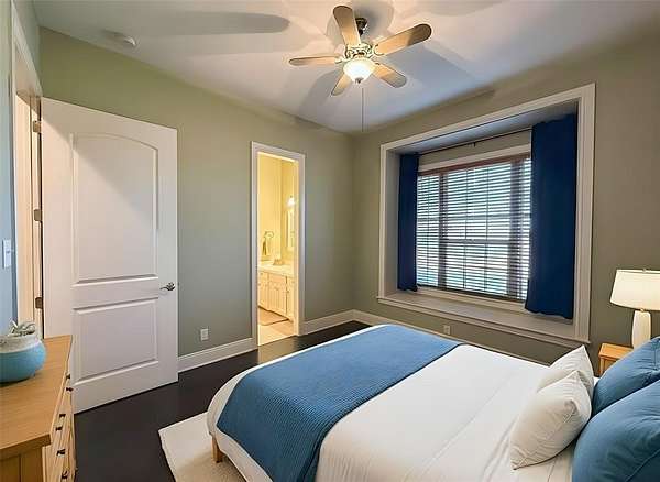 The private owner’s suite includes a spa-like bath with soaking tub, oversized shower, dual vanities, and a custom walk-in closet. Secondary bedrooms offer generous space and extra-deep closets.