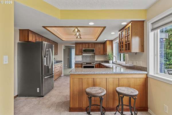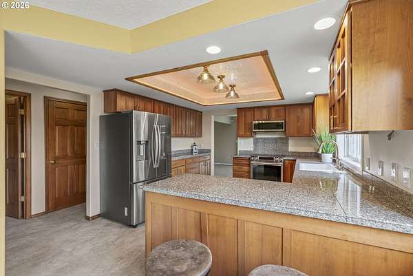- Builtin Range, Dishwasher, Free Standing Refrigerator, Granite, Microwave, Stainless Steel Appliance, Tile