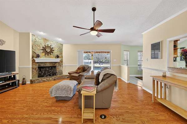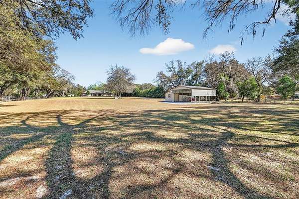 Located in the sought-after equestrian community of Wolf Branch Estates, this beautifully maintained 3 bedroom, 2 bath pool home offers 2,242 square feet of heated living space on 2.25 acres beneath a canopy of grand oak trees. A horseshoe circular driveway, side-entry two-car garage, and separate golf cart garage create impressive curb appeal as you arrive at this inviting ranch-style property. An open front porch welcomes you inside, where the pride of ownership is immediately evident. The foyer is flanked by formal living and dining rooms, leading into a spacious family room featuring vaulted ceilings, rich wood flooring, and a striking stone wood-burning fireplace. The updated kitchen offers granite countertops, newer appliances, and a cozy dinette area overlooking the screened pool and spa. Sliding glass doors fully pocket into the wall, creating seamless indoor-outdoor living and opening to the covered lanai—perfect for entertaining. The primary suite features direct pool access and a walk-in closet with a cedar accent wall. The split floor plan provides privacy, with generously sized secondary bedrooms and a guest bath that also serves as a pool bath. The property is zoned for horses and offers exceptional storage and flexibility, including a 30’ x 10’ rear storage garage and a 35’ x 25’ x 12’ covered metal RV/boat storage area, making it ideal for those with recreational vehicles, boats, or additional equipment. Additional features include ceiling fans throughout and rain gutters. Major updates include a new HVAC in 2023, new hot water heater in 2024, and a new roof scheduled for 2026. Ideally located just minutes from Historic Mount Dora’s restaurants, shops, and marina, with convenient access to the Wekiva Parkway for an easy Orlando commute, this property delivers space, privacy, and lifestyle all in one.