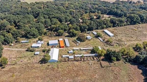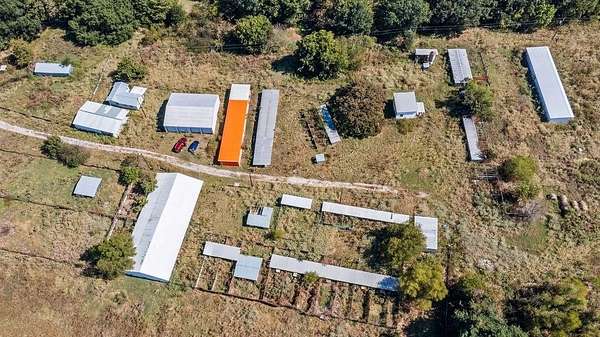 The lower section of the land features a comfortable 4-bedroom home surrounded by a few support buildings, all situated on 3 acres near the road. The heart of the operation lies "up on the hill," where the property truly shines. Here you'll find over 30 buildings totaling more than 24,000 square feet, many of which are already equipped with electricity, water, and propane. Several buildings feature concrete floors, while others have gravel, providing a range of functional spaces for various uses.