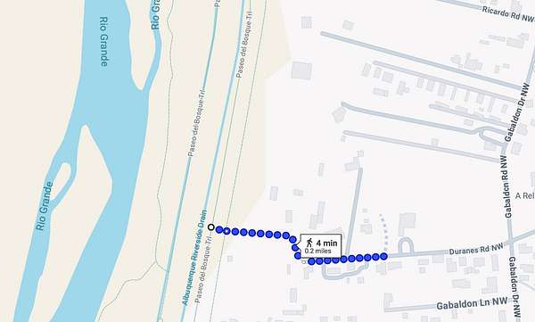 Go north on Rio Grande Blvd from I-40. Go west on Floral Road for 0.7 miles. Turn left onto Duranes Road and go 0.2 miles west to the property which is on the north side of the street in between two homes.