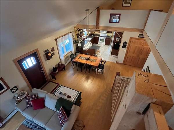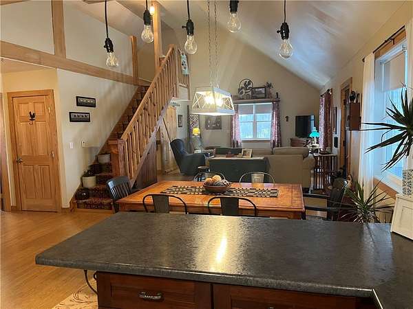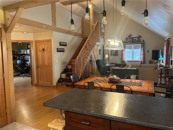 Welcome to this stunning farmhouse-inspired retreat, perfectly situated on three picturesque acres with breathtaking views. Built in 2008, this thoughtfully designed 3-bedroom, 2-bath home offers warmth, character, and exceptional craftsmanship throughout. Step inside to vaulted ceilings in the living and dining areas, creating an open and inviting space filled with natural light. Rich wood accents and custom woodwork add timeless charm and warmth to every corner of the home. The kitchen is a true centerpiece, featuring solid cherry cabinetry that blends beauty and durability - perfect for everyday living or entertaining guests. Upstairs, a spacious loft area offers incredible flexibility and can easily serve as a fourth bedroom, home office, or bonus room tailored to your needs. Comfort is effortless here with dual heating options - propane or a cozy outdoor, wood stove that can efficiently warm the entire home. The basement adds even more versatility, complete with its own heating zone. Half of the lower level is dedicated to a workshop space and includes a walk-out door, making it ideal for hobbies, storage, or projects. One of the home's most unique features is the ability to close off a bedroom and bathroom to create a private mother-in-law suite - perfect for extended family, guests, or potential rental opportunity. If you've been dreaming of peaceful country living with modern conveniences and handcrafted charm, this beautifully maintained property offers the perfect blend of comfort, flexibility, and scenic tranquility.