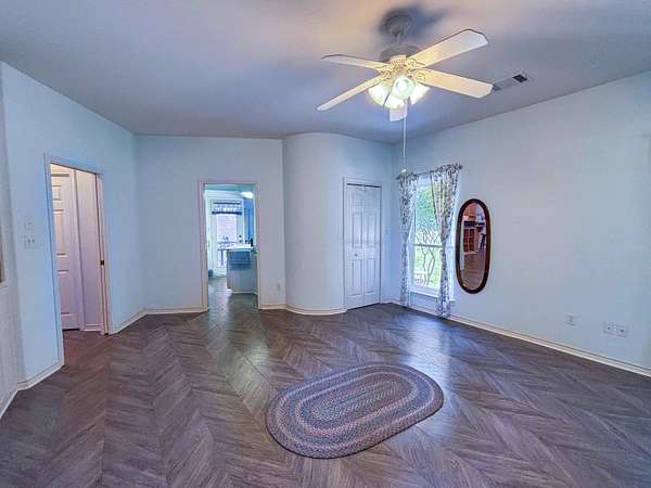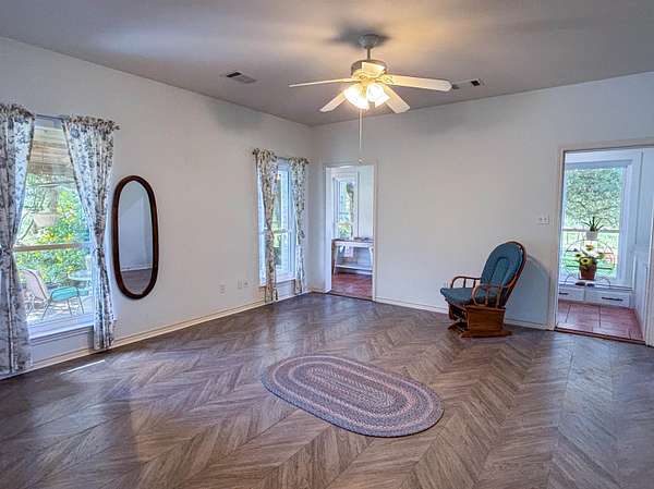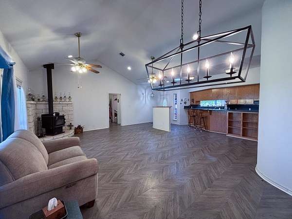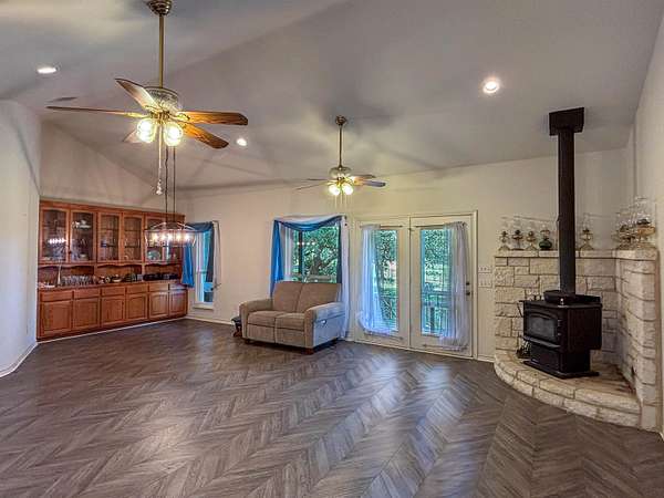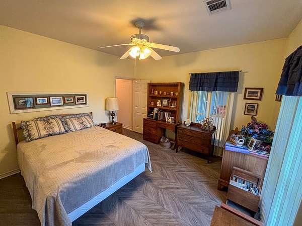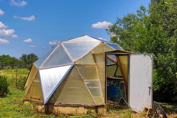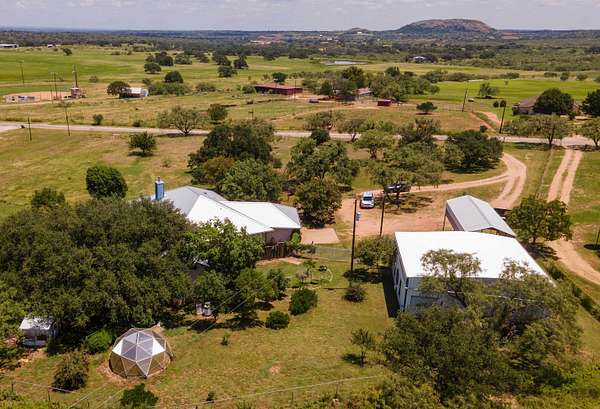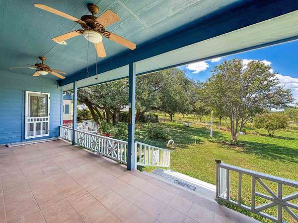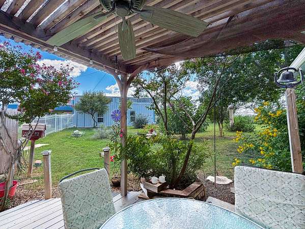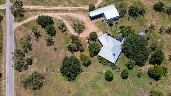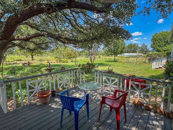 Custom 3-2 1/2 home on 6+ acres. No HOA just outside city limits with city water to the home and a well is in place to irrigate the beautifully shaded yard. Many large oak trees shade the property. Bedrooms are large with great closets and a generous walk-in closet in the master bedroom. Open living/dining area with high ceilings. Loads of counter space with granite counter tops and a very large pantry. Lots of storage. There's also a large metal barn/workshop area with a great work shop area and 1/2 bath and an RV cover. Enjoy the birds and other wildlife on one of the shaded patios or porches. Property is perimeter fenced with chainlink fence around the back yard so your dogs can be out and stay close to home. This home has many extras and amenities. You have to look at it to appreciate everything it offers.