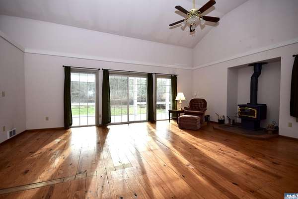 Est $3,146/moFive acres of privacy & tranquil views of yard, seasonal pond & hundreds of trees. Three bedroom, 2 bath home. (First bedroom was finished as an office.) Large living room with wood stove, windows to the south for lots of sun, & attached porch with views to backyard. Nice kitchen with large eating area. Separate indoor laundry room. Two car garage with additional room area for shop/storage/hobbies. No HOA. Lots of possibilities
