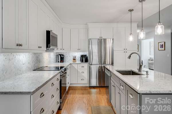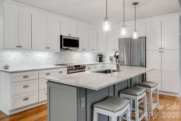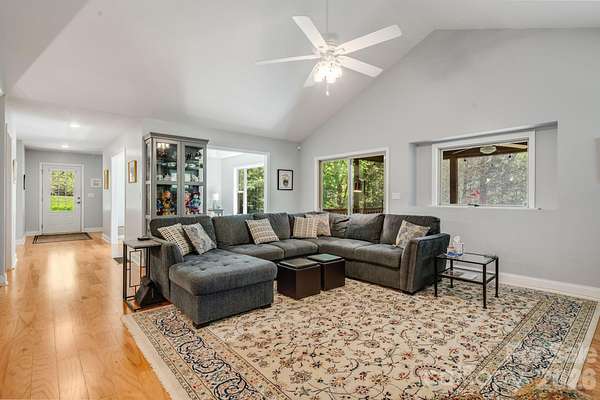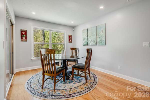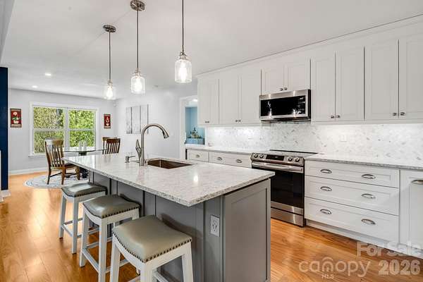 Welcome to refined mountain living in the Rebecca's Pond community. This beautifully updated single-level home is ideally situated with a front row seat to year-round mountain views, and the community pond and fountain. The home's multiple outdoor living spaces elevate everyday living. Enjoy peaceful mornings and golden-hour evenings from the screened-in porch, enjoy an outdoor dinner on the covered porch, or gather around the fire pit on the private patio - perfectly designed for quiet moments and effortless entertaining. Inside, the home exudes humble elegance. The fully updated kitchen is a standout, featuring quartz countertops, custom cabinetry, stainless steel appliances and refined finishes that balance style and function. Engineered hardwood flooring flows throughout the main living areas, connecting a welcoming family room and an additional living space designed for comfort and versatility. The primary suite offers a true retreat, complete with a spa-inspired bathroom showcasing porcelain tile, upgraded fixtures, and a luxurious jacuzzi tub. Two additional bedrooms and a elegantly updated second bath provide flexibility for guests or a home office. Additional features include a dedicated laundry room and a spacious two-car garage, all thoughtfully designed for ease of living.