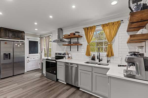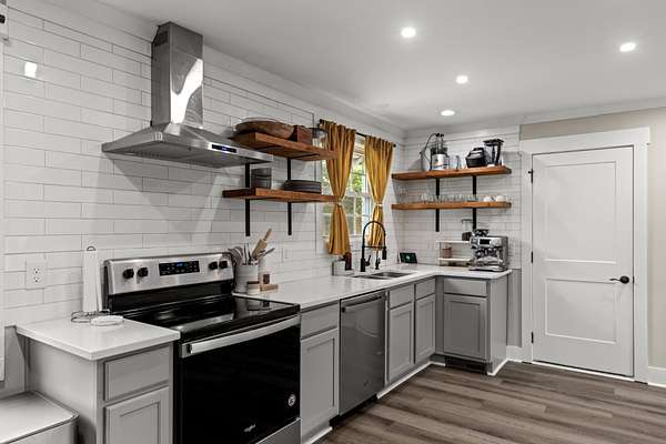 - Dishwasher, Electric Oven, Electric Range, Refrigerator, Stainless Steel Appliance(s)