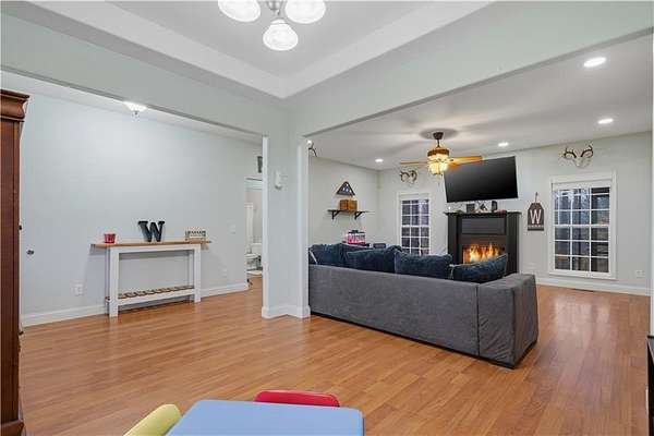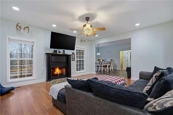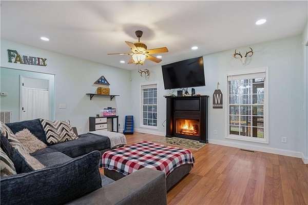 Situated on an expansive 14.29-acre lot in Resaca, 323 Lloyd Way offers a rare combination of privacy and functional living space. This ranch-style residence spanning 2,200 square feet provides a secluded retreat while remaining accessible to local amenities. The property is characterized by its vast acreage, featuring a mix of cleared land and mature timber, making it ideal for those seeking outdoor versatility or a private homestead. The exterior of the home features a classic gabled roofline and a deep rocking chair front porch that overlooks the long, private gravel driveway. Upon entering, the interior reveals an open-concept layout designed for effortless movement between living areas. The central family room is anchored by a fireplace and flows seamlessly into the dining area, creating an inviting atmosphere for hosting guests. High ceilings and neutral paint tones enhance the sense of space throughout the main level. The kitchen is a standout feature, equipped with extensive cabinetry that provides ample storage. It features durable countertops, stainless steel appliances, and a unique slate-tiled floor that adds character to the space. Adjacent to the kitchen, the breakfast room offers a casual dining spot with views of the surrounding woods. The primary suite is a dedicated wing of the home, offering a spacious bedroom and an oversized primary bathroom. This ensuite includes a double vanity, a large soaking tub positioned under a private window, and a separate shower, along with a massive walk-in closet. Two additional bedrooms share a well-appointed full bathroom on the opposite side of the home, ensuring privacy for everyone. Upstairs, a large bonus room located above the garage offers flexible space that can serve as a home office, media room, or gym. Outdoor living is a priority for this estate. A screened-in back porch provides a sheltered spot to enjoy the summer breeze without the nuisance of insects. Beyond the porch, an open wooden deck is perfect for grilling or sunbathing. The backyard includes a fenced area, suitable for pets or a garden, and a stone fire pit area for evening gatherings. With over 14 acres to explore, the possibilities for recreation and expansion are nearly limitless. Contact us today to schedule a private tour of this impressive acreage.
