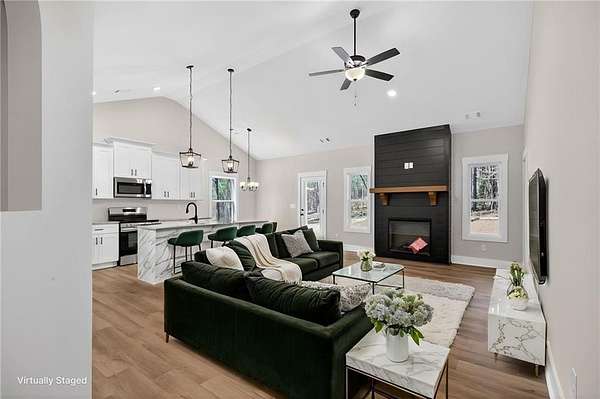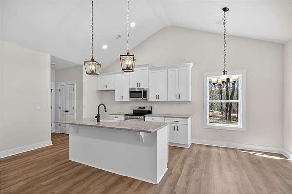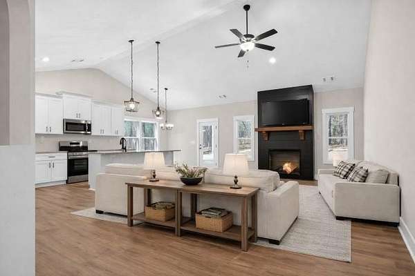Construction is just underway! Don't miss your chance to own a spacious ranch on 3 private acres with no HOA and plenty of room to enjoy. Seize this opportunity to own your own private 4.92 Acre lot! This stunning, new, step-less, craftsman-style ranch offers modern country living at its BEST! The open floor plan features a vaulted family room highlighted by a custom shiplap fireplace. The gourmet kitchen is designed for entertaining and showcases an oversized custom island, a charming farmhouse sink, stainless steel appliances, upgraded soft-close shaker cabinetry, granite countertops, and a huge pantry. A separate laundry room adds everyday convenience and functionality. The primary suite offers a luxurious en-suite bath with a breathtaking tile shower featuring a custom glass door, along with a spacious walk-in closet. Two generously sized secondary bedrooms offer ample storage space with large closets and are complemented by a beautifully appointed full bathroom. Every detail throughout the home exudes luxury and thoughtful design, creating a space that is both inviting and practical. Relax on the picturesque front porch while enjoying your private, tree-lined view. The oversized covered back porch is ideal for both relaxing and entertaining and features a custom wood-burning outdoor fireplace. This gorgeous modern farmhouse design will include upgraded, striking BLACK EXTERIOR windows. Standard features include durable exterior vinyl siding, luxury LVP flooring in the kitchen, living room, entry, and baths, plush carpeting in the bedrooms, and high-quality finishes throughout. Enjoy the freedom of a private lot with no HOA restrictions, offering the perfect blend of tranquility and convenience. Not quite the right floor plan or lot? We have additional lots and floor plans available. Please note that the interior & exterior photos are not of the actual home but are representative of this plan. Don't miss this rare opportunity to create your dream home in a tranquil setting.