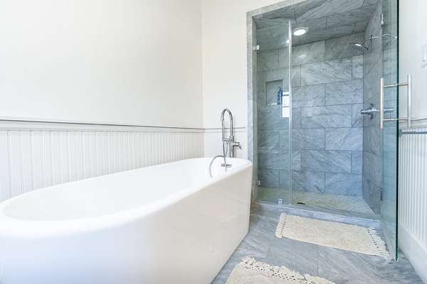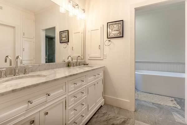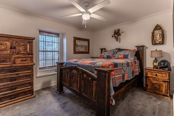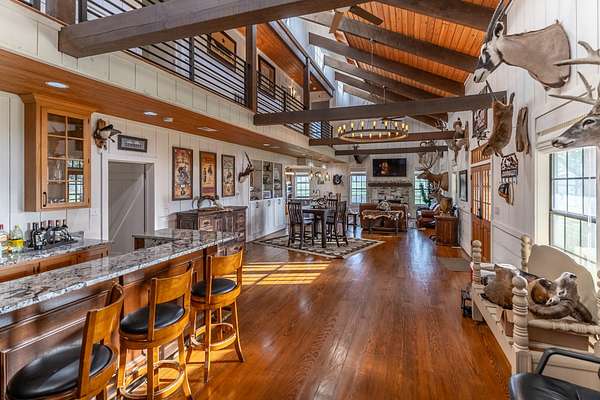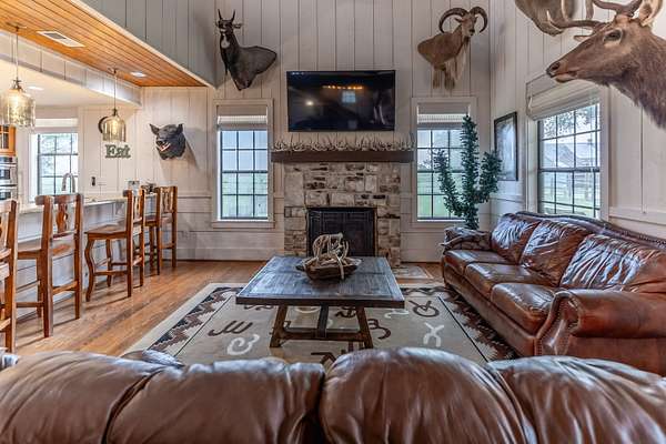 The Main Lodge features a luxurious master bedroom on the main floor, complete with a spacious shower, a soaking tub, and double vanities topped with marble countertops. Also on the first floor, you'll find a convenient half bath and a laundry room. Upstairs, four generously sized bedrooms await, three of which feature private ensuite bathrooms. Designed with entertaining in mind, the Lodge showcases a stunning grand chandelier, a modern, fully equipped kitchen, and an expansive living room--perfect for hosting gatherings. A large, stylish bar completes the space, offering an inviting area for socializing and entertaining guests.