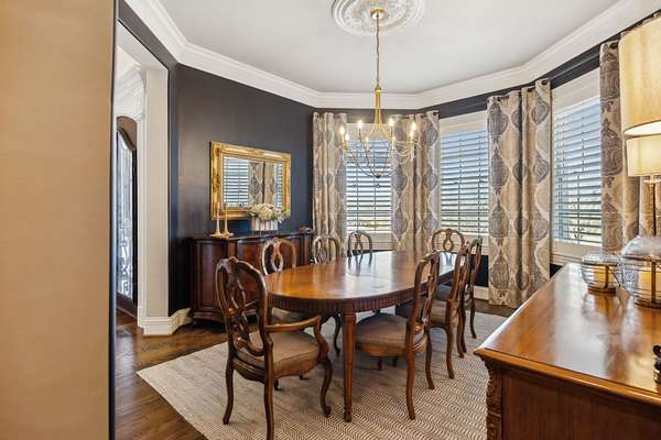 The home is finished with decorative moldings, crown moldings and built-ins, creating an atmosphere of luxury and charm. Exposed brick accents and a curved staircase add character, while floor-to-ceiling and bay windows with elegant window treatments provide abundant natural light with eastern front/western rear exposure.