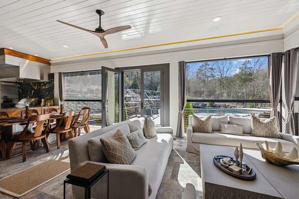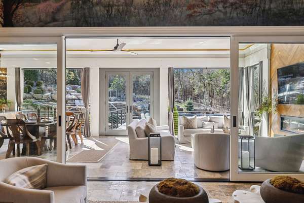 Well-appointed kitchen and living areas feature stunning hardwood and tile floors. Step outside to enjoy the meticulously landscaped front and back yards, complete with a porch, patio, barbecue area, and fencing. The pool/hot/tub/fire pits/outdoor grill area are a resort-like oasis. The three season patio room offers heated floors, seating, a fireplace, cypress wood accents, full dining area and a chef kitchen with commercial grade venting system. The electric front gate enhances privacy and security, while the partial basement/garage and encapsulated crawl space offer additional flexibility and storage, with a full bathroom down as well.