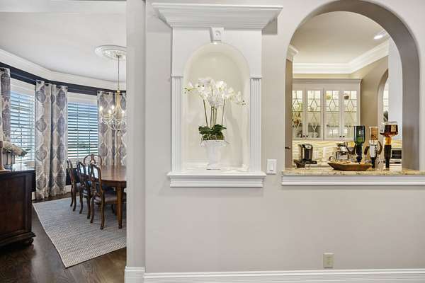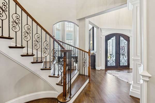 Enjoy fenced grounds Electric front gate adds a neighborhood home with privacy. Two garages with space for six vehicles.