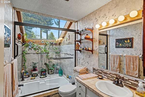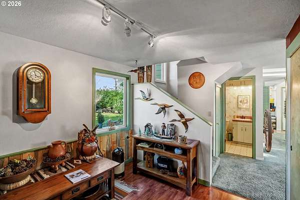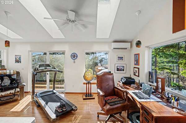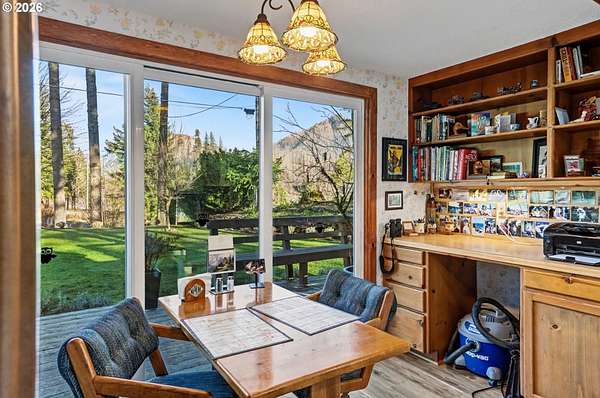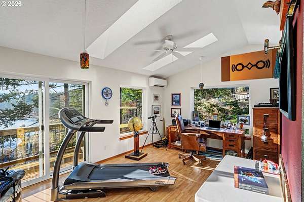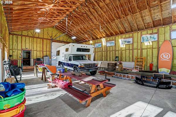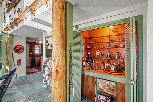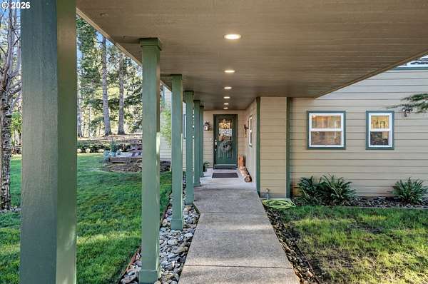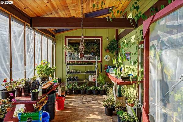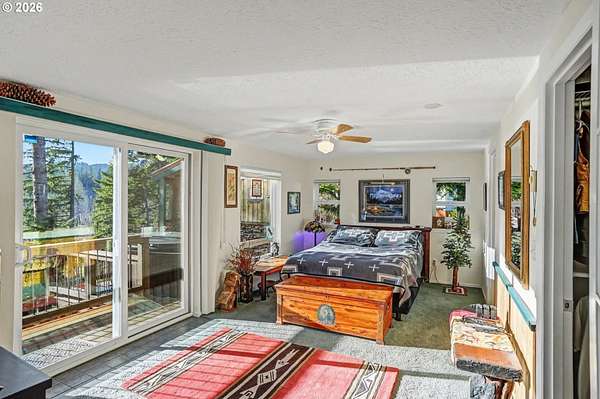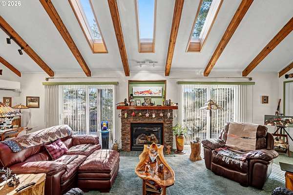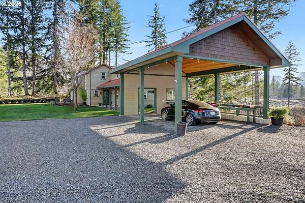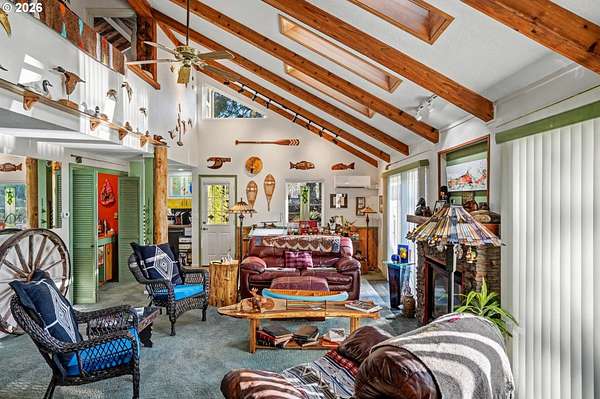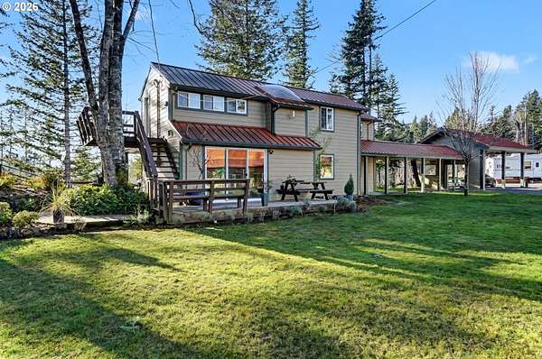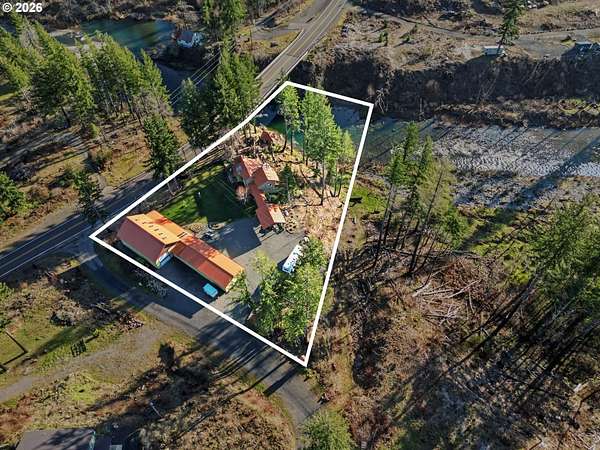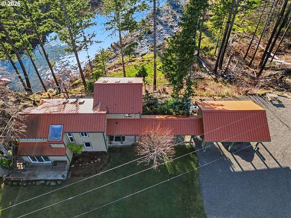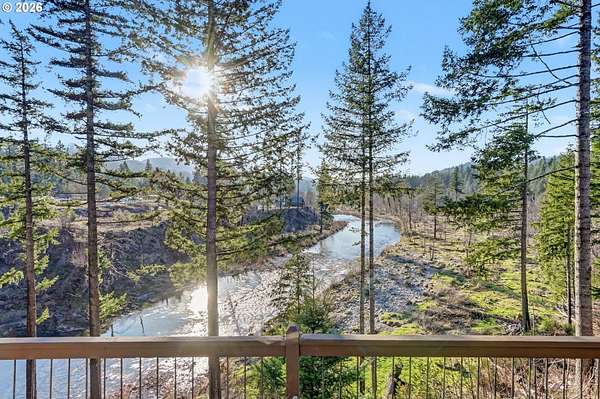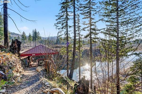 Set along the pristine North Fork River, this one-of-a-kind custom riverfront property offers privacy, craftsmanship, and lifestyle on approximately 1.5 acres surrounded by a non-buildable buffer. The ~2,200 sq ft, two-story home has an effective date of the early 2000's features concrete siding, a metal roof, and triple-pane windows and doors, blending Mediterranean craft style with thoughtful design.Interior highlights include stained open-beam ceilings, knotty pine accents, skylights, picture windows, and a great room with gas fireplace and heat pump system. Sliding glass doors connect indoor living to decks and patios with river and garden views. The galley kitchen showcases custom floral-painted cabinetry by internationally recognized artist Patricia Woof, tile countertops and splash boards, quality appliances, and a bright breakfast nook with built-ins and office/library space.The primary suite offers French glass doors, private balcony access, outdoor hot tub and shower areas, walk-in dressing room, and a spacious bath with soaking tub, walk-in shower, and pet-wash hardware. Guest accommodations include a fully tiled bath with indoor terrarium and skylight, plus a vaulted-ceiling guest bedroom with custom built-ins and deck access.Outdoor amenities include covered patios, a river-view pavilion with power, swimming access, full RV hookups, and a rare county-built rock dock overlooking salmon and steelhead movement. Two large outbuildings provide nearly 4,000 sq ft under roof, including a heated workshop and high-bay RV storage. A greenhouse with skylights and native landscaping completes this exceptional riverfront retreat.