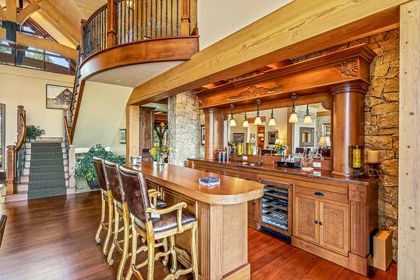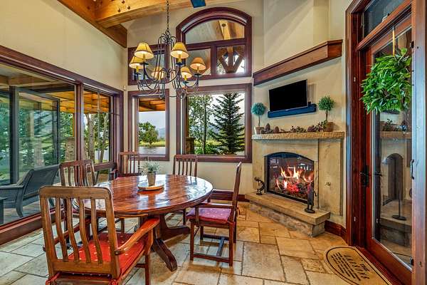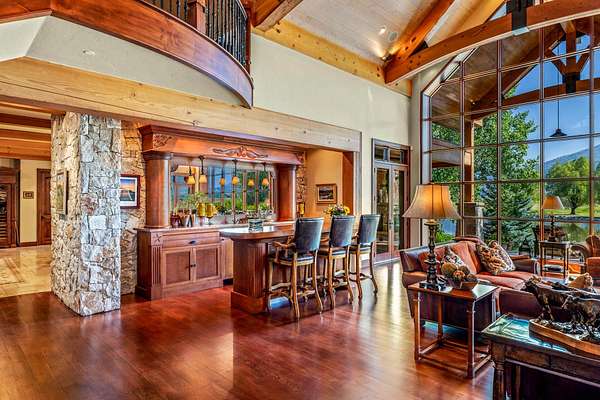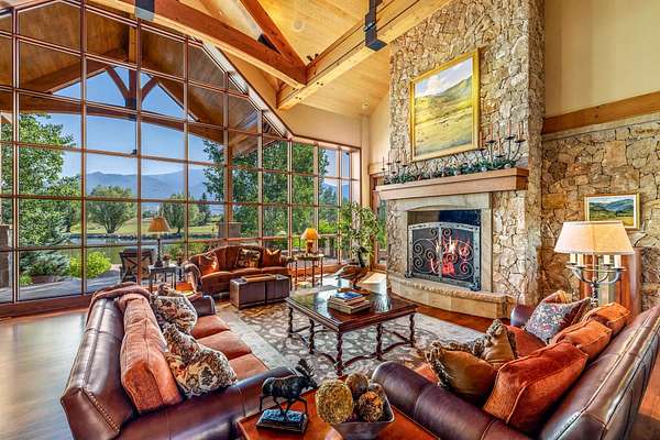 The residence is designed for multi-generational living, with architectural excellence and a seamless connection to the land. Stepping inside, you're greeted by a breathtaking two-story wall of windows framing panoramic views of ski slopes, hayfields, and surrounding mountains. Cathedral ceilings, rich woodwork, and a light-filled, open floor plan set the tone for a home that is both sophisticated and welcoming.