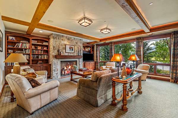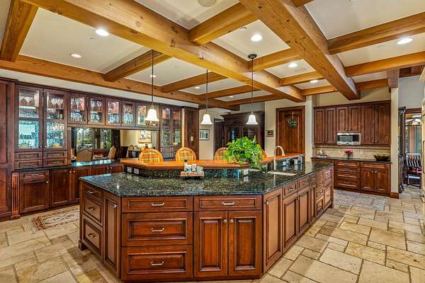 The gourmet kitchen is a chef's dream, offering abundant natural stone counters, a custom cherry island, a breakfast nook, wine storage, and a walk-in pantry. It flows effortlessly into a grand dining room with coffered ceilings--ideal for intimate dinners or gatherings of twelve or more. Designed for entertaining, the home features a media room, handcrafted bars, five fireplaces, multiple dens, and game areas.