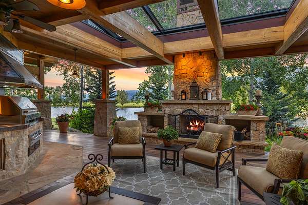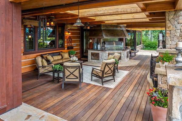 Indoor and outdoor living blend effortlessly, with patios, decks, an outdoor kitchen, and sitting areas surrounded by ponds and lush landscaping. The legacy estate incorporates sustainable technology, including a solar arrays system, harmonizing modern luxury with environmental stewardship.