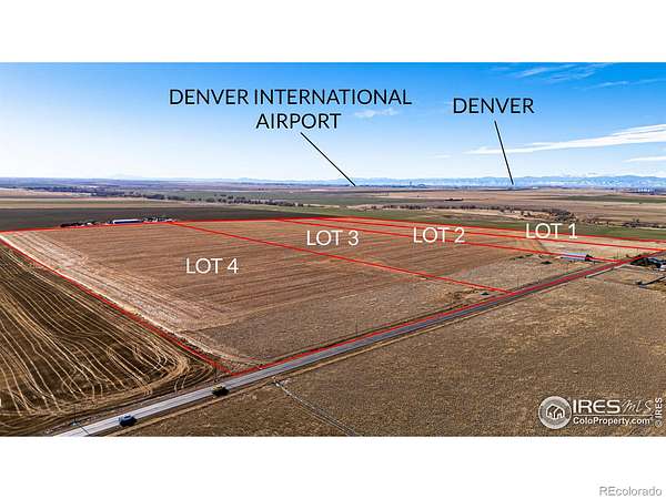 Uncover four stunning lots ranging from 36 to 48 acres, just minutes from Denver International Airport. Enjoy breathtaking mountain views and the potential for your dream home. Each lot offers unique features, including water rights and excellent storage options. These are four, 36 to 48 acre lots on 120th Avenue located just northeast of Denver International Airport. The four lots range in price from $400,000 to $450,000. 120th Avenue has recently been upgraded and is an excellent paved highway. These lots are well situated 14 miles from Brighton, Colorado, 12 miles from Denver International Airport and 11 miles to E-470. The land is currently being farmed but will soon be the location of your dream home. The views are incredible and offer views from Pike's Peak to Long's Peak. You have to see to believe! Lot 1 (*SOLD) has an old home with a domestic well permit #74428 that is a scraper, but the well can be utilized; priced at $425,000. Lot 2 is vacant and would need to have a well drilled; priced at $400,000. Lot 3 (*SOLD) offers an excellent quonset, giving you excellent storage for your toys; priced at $450,000. Lot 4 (*under contract) is the largest of the lots available at +-48 acres; priced at $425,000. 15 minutes to DIA. 40 minutes to Downtown Denver. 18 minutes to Brighton, Colorado