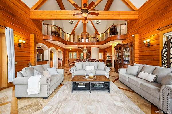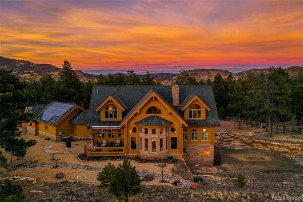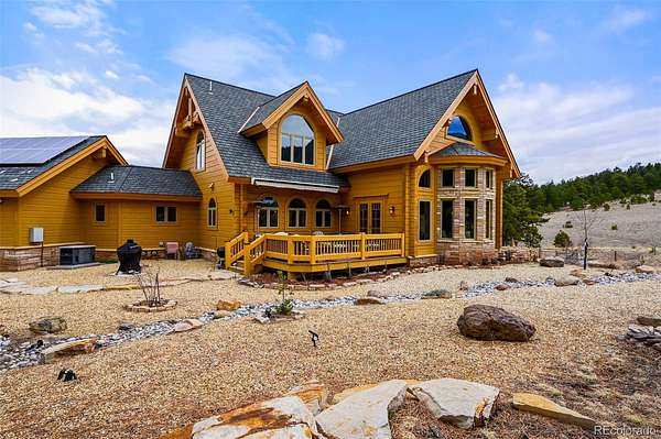 Immerse yourself in the beauty & tranquility of this extraordinary mountain home, tucked away in a gated community only 45 min outside Canon City. Blending sophistication & nature, this stunning sanctuary will leave you in awe! From the moment you enter, the soaring ceilings & striking accent beams create an atmosphere of rustic elegance. This masterpiece is constructed from premium custom-engineered Honka logs, blending timeless charm with modern functionality. In the heart of the home, the adjoined kitchen, dining & living areas are perfect for gathering. The exquisite travertine flooring, enhanced by rich cherry wood inlays enhances the warmth & refinement of the space, while expansive custom windows frame breathtaking panoramic views from every room & seamlessly blending the indoors with your surroundings. The main floor primary bedroom shares a double-sided fireplace with the formal dining & offers a beautifully appointed soaking tub in the connected bath. The refined wrought iron staircase showcases superior architecture and on the upper level you will find a dedicated library (or office) along with vaulted ceiling bedrooms & cozy window nooks. The amenities continue into the walk out basement where you will find endless space for entertaining/hobbies & guest privacy. The 3 car garage & additional parking is perfect for an RV or other storage. No detail has been overlooked extending to the exterior where endless charming landscaping awaits. For those craving adventure, this property grants direct access to pristine BLM land. Explore opportunities for adventure, hiking & the abundant wildlife from majestic elk & deer to other inhabitants right from your backyard! Designed for both year round comfort & self-sufficiency, this home comes equipped with a fully automatic generator, offering seamless convenience & security. With the perfect fusion of refined craftsmanship & back country, this exceptional estate is more than just a home - it’s a lifestyle.