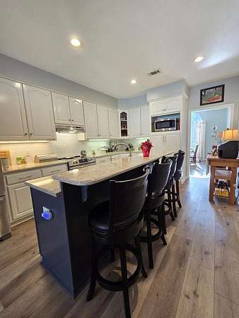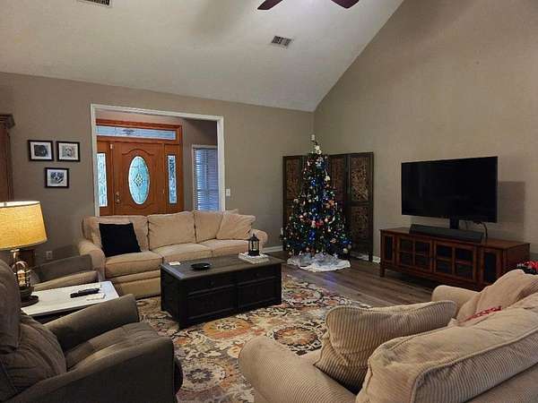 See this Beautiful, well-maintained home located in the desirable Harris County's Mulberry Grove area. This home features numerous updates, such as the kitchen, primary bathroom, and hall bathroom. Updates include LVP flooring, quartz countertops in the kitchen and hall bath, granite countertops, and tile flooring in the owner's bath. A large foyer opens up to the family room, which has a fireplace and the convenience of gas. The family room is also open to the kitchen and has access to the screened-in porch. The eat-in kitchen boasts a large breakfast bar and is open to the family room, and the kitchen-dining area has a bay window with a view of the atrium, pool, and the backyard. From the family room, you can step out to the large screened-in porch with a brick wood-burning fireplace. and a great view of the swimming pool and backyard, perfect for game day and pool gatherings. Another plus is a large owner's suite with a walk-in closet, an in-suite bath that has tile and granite, a 6-foot Air Tub for a luxurious body massage, a separate shower, a double vanity, and a linen closet. You will love all the outdoor living (Spring, Summer, and Fall) space with the screened porch, atrium, pool, and garden areas. The pool is surrounded by 8-foot concrete decking, which provides additional space for outdoor furniture and other outdoor activities. You will love hanging out on the screened porch, enjoying the beautiful landscaped backyard, which includes a large garden area for summer vegetables, landscaped with trees such as fig, tea lilies, 3 blueberry bushes, Butterfly tree, gardenia bushes, and ezellas, along with many decorative plants and flowers during the Spring and Summer months. The home is a 4-sided Brick home with vinyl and fascia soffits. The garage interior is also Vinyl, as well as the screen porch ceiling.