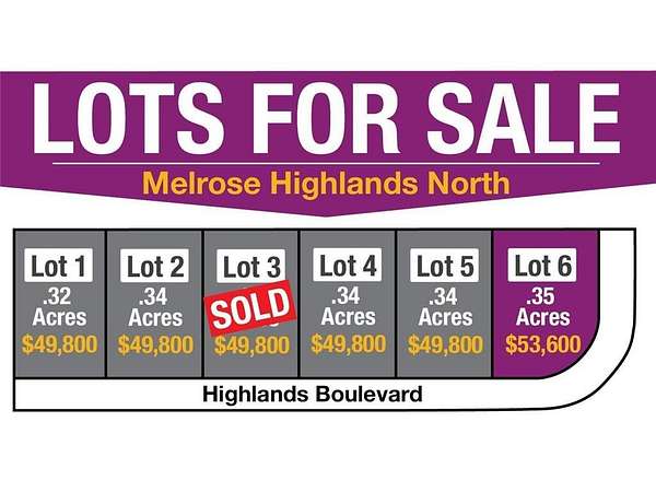 Est $413/moExciting new lots available in the City of Melrose! Build your dream home on a spacious .35 acre lot in a popular neighborhood with city utilities. Six total lots available; need more space... buy the adjacent lot. No builder restrictions; choose the builder you want! Located close to schools, parks and shopping. Don't miss this opportunity to become part of this wonderful community!