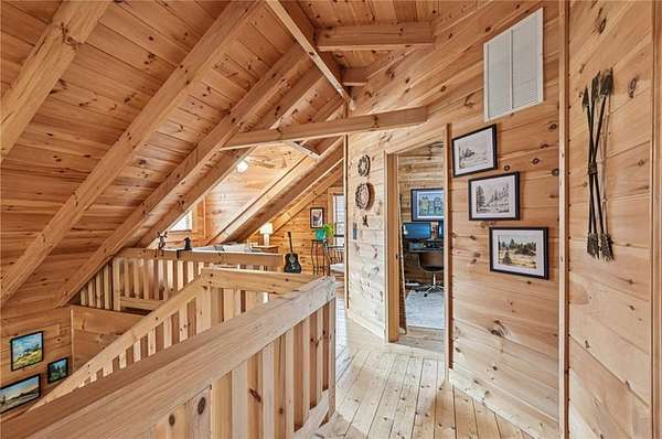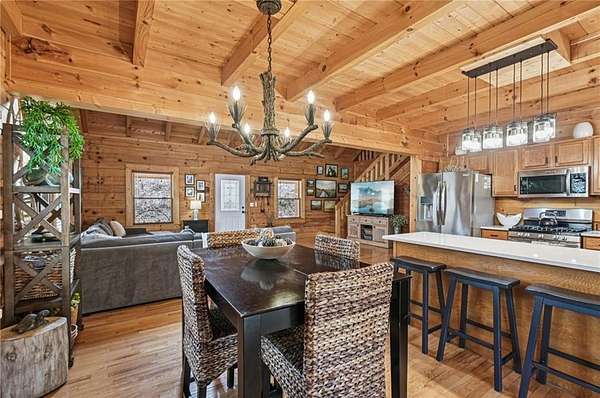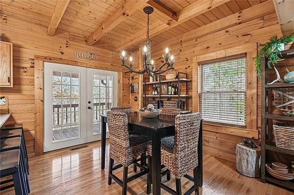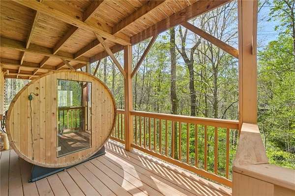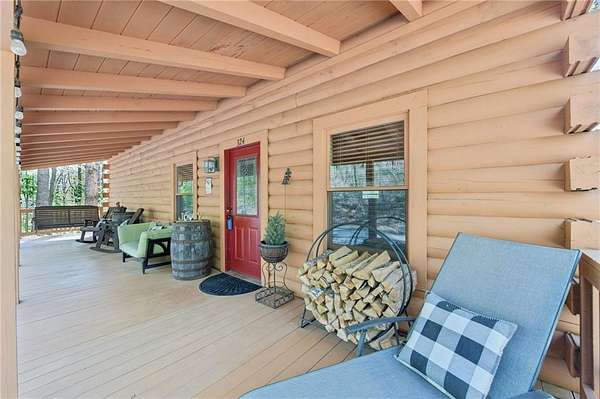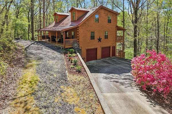 Experience serene mountain living in Cherokee County on 2.19 private, wooded acres with no HOA. This inviting log home features vaulted ceilings, a loft, abundant natural light, and a beautifully updated kitchen with quartz countertops and newer stainless steel appliances (2023), plus a new washer (2025). Major systems have been thoughtfully updated, including an HVAC system under 5 years old, a metal roof under 8 years old, a tankless water heater, spray-foam insulation, and a recently serviced septic system. Custom blinds are installed throughout for added comfort and style. Enjoy the outdoors from fully covered front and back decks, or unwind on a secluded private deck complete with a Swedish barrel sauna. Wildlife is frequently spotted, and morning sunlight pours through the expansive vaulted windows. A peaceful stream runs through the property, enhancing its natural appeal. The oversized drive-under garage and basement level provide versatile space for a workshop, home gym, or additional storage. Ample parking includes a dedicated gravel pad for a boat, trailer, or RV. A transferable leased whole-home generator adds peace of mind, and multiple internet options are available thanks to a nearby T-Mobile tower. Tucked away on a quiet cul-de-sac with large lots and minimal traffic, this home offers a sense of retreat while still being conveniently located near Canton, Woodstock, Cartersville, Lake Allatoona's Wilderness Camp Marina, major highways (I-75 & I-575), and a popular local winery just across the main road. A rare combination of privacy, convenience, and mountain charm-schedule your tour today!