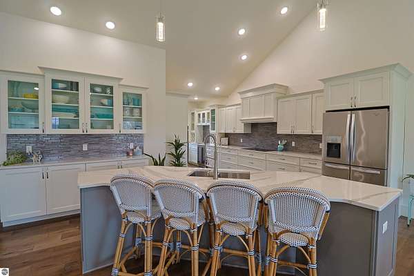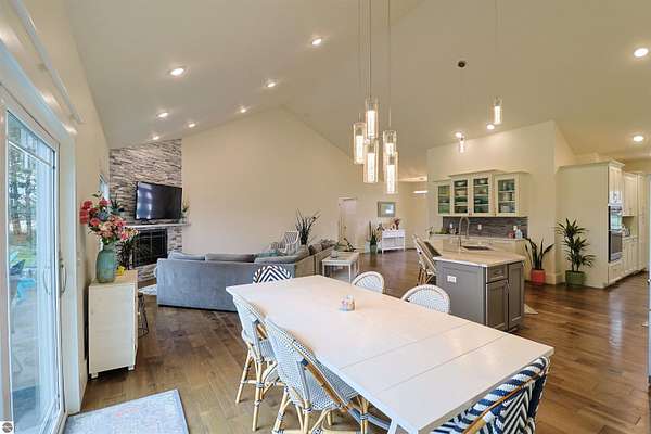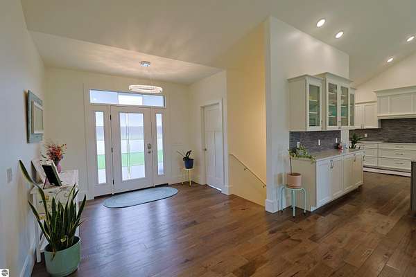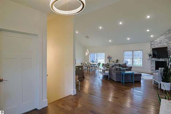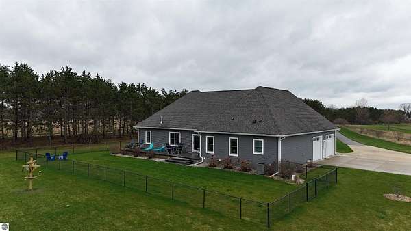 This nearly 5,000 square foot ranch home offers the kind of quality, space, and setting that is hard to find. Built just 9 years ago and situated on over 7 private acres, this one-story home combines impressive craftsmanship with a thoughtful layout designed for both everyday living and entertaining. The main floor features beautiful wood flooring throughout, 3 bedrooms, 2 full baths, and main floor laundry, along with a spacious open-concept living area highlighted by a floor to ceiling stacked stone wall with a fireplace. The soaring ceilings and expansive windows help bring in natural light and peaceful views. The kitchen is a standout with extensive cabinetry, quality finishes, generous counter space, and a large island that opens seamlessly to the dining and living areas. The primary suite offers a spacious retreat with a beautifully finished bath and excellent closet space. Downstairs, the finished lower level adds 2 more bedrooms, a large family room with wet bar, and a separate 26x15 room currently used as a theater room, offering exceptional flexibility for recreation, hobbies, or hosting guests. Outside, the fenced yard provides great usable space while the surrounding acreage creates a private and relaxing setting. Home has RING Doorbell